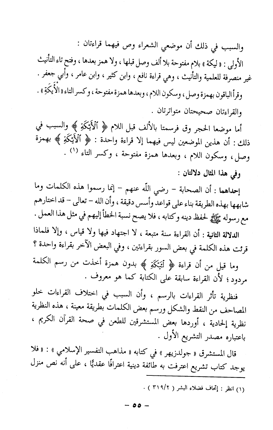 إحداهما أن الصحابة -رضي الله عنهم- إنما رسموا هذه الكلمات وما شابهها بهذه الطريقة بناء على قواعد وأسس دقيقة، وأن الله -تعالى- قد اختارهم مع رسوله -صلى الله عليه وسلم- لحفظ دينه وكتابه، فلا يصح نسبة الخطأ إليهم في مثل هذا العمل.