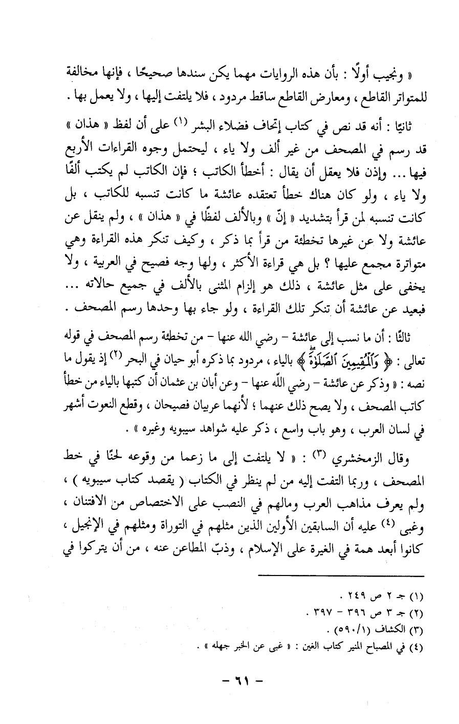 ثالثا: أن ما نسب إلى عائشة -رضي الله عنها- من تخطئة رسم المصحف في قوله تعالى: {وَالْمُقِيمِينَ الصَّلاة} بالياء، مردود بما ذكره أبو حيان في البحر2 إذ يقول ما نصه: "وذكر عن عائشة -رضي الله عنها- وعن أبان بن عثمان أن كتبها بالياء من خطأ كاتب المصحف، ولا يصح ذلك عنهما، لأنهما عربيان فصيحان، وقطع النعوت أشهر في لسان العرب، وهو باب واسع، ذكر عليه شواهد سيبويه وغيره".