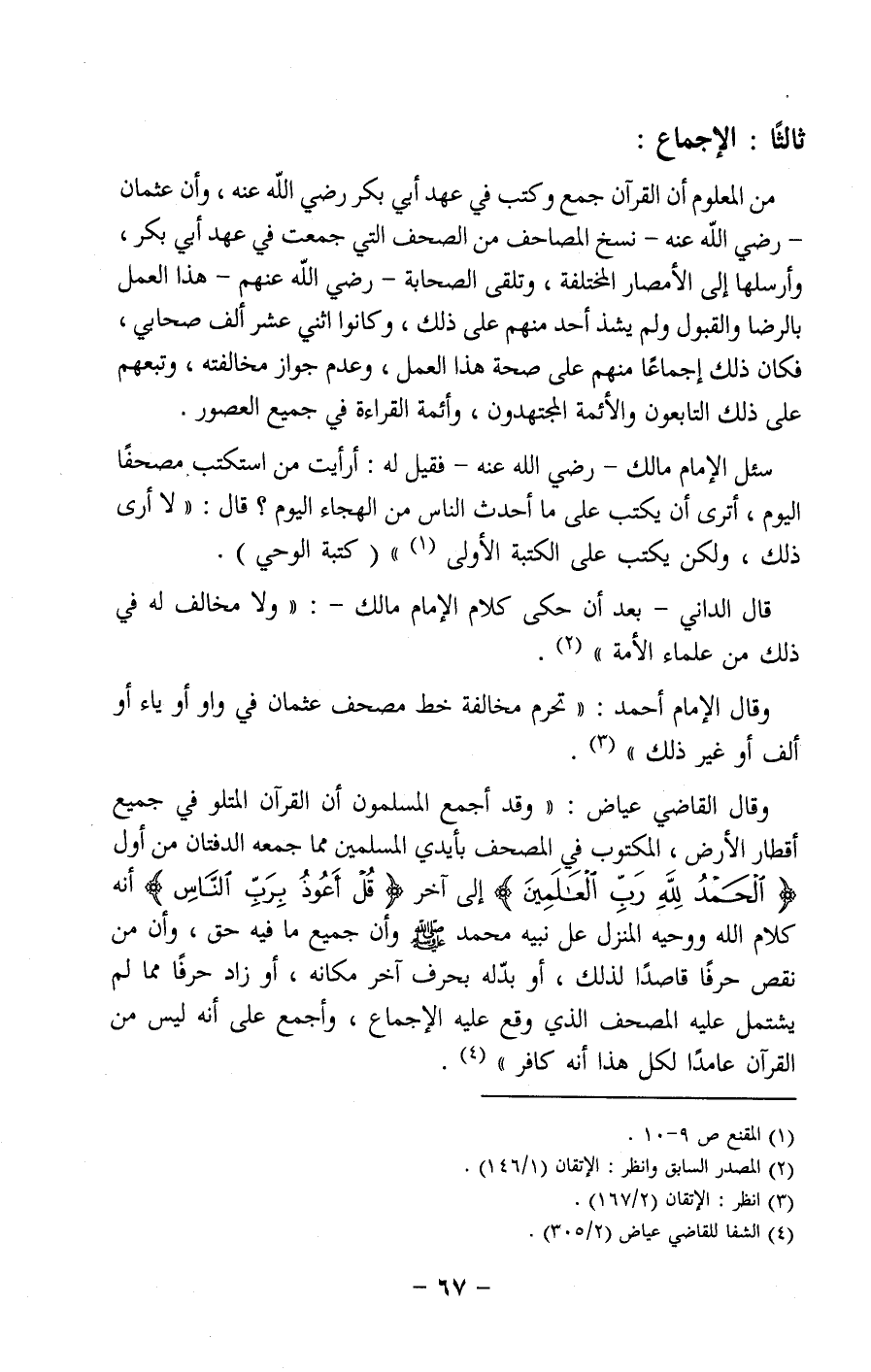 وقال القاضي عياض: "وقد أجمع المسلمون أن القرآن المتلو في جميع أقطار الأرض، المكتوب في المصحف بأيدي المسلمين مما جمعه الدفتان من أول {الْحَمْدُ لِلَّهِ رَبِّ الْعَالَمِين} إلى آخر {قُلْ أَعُوذُ بِرَبِّ النَّاس} أنه كلام الله ووحيه المنزل على نبيه محمد -صلى الله عليه وسلم- وأن جميع ما فيه حق، وأن من نقص حرفا قاصدا لذلك، أو بدله بحرف آخر مكانه، أو زاد حرفا مما لم يشتمل عليه المصحف الذي وقع عليه الإجماع، وأجمع على أنه ليس من القرآن عامدا لكل هذا أنه كافر"4.