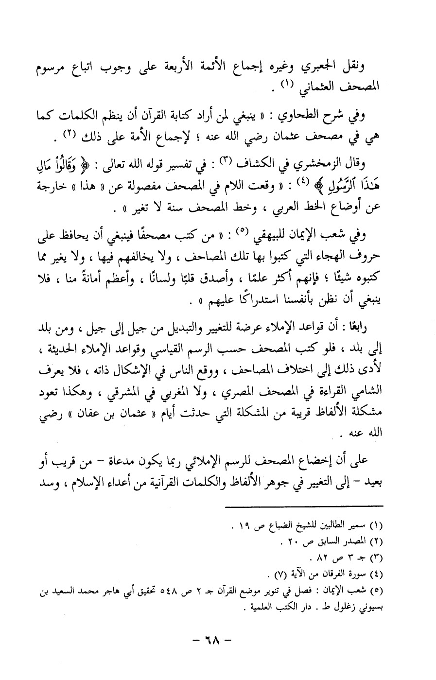 وفي شرح الطحاوي: "ينبغي لمن أراد كتابة القرآن أن ينظم الكلمات كما هي في مصحف عثمان رضي الله عنه، لإجماع الأمة على ذلك2.