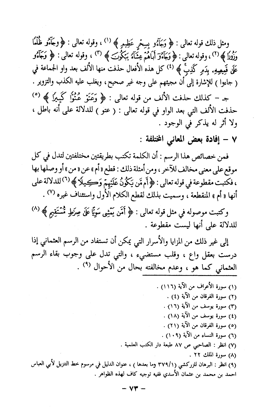 9 انظر: البرهان للزركشي "1/ 379 وما بعدها"، عنوان الدليل في مرسوم خط التنزيل لأبي العباس أحمد بن محمد بن عثمان الأسدي ففيه توجيه كاف لهذه الظواهر.