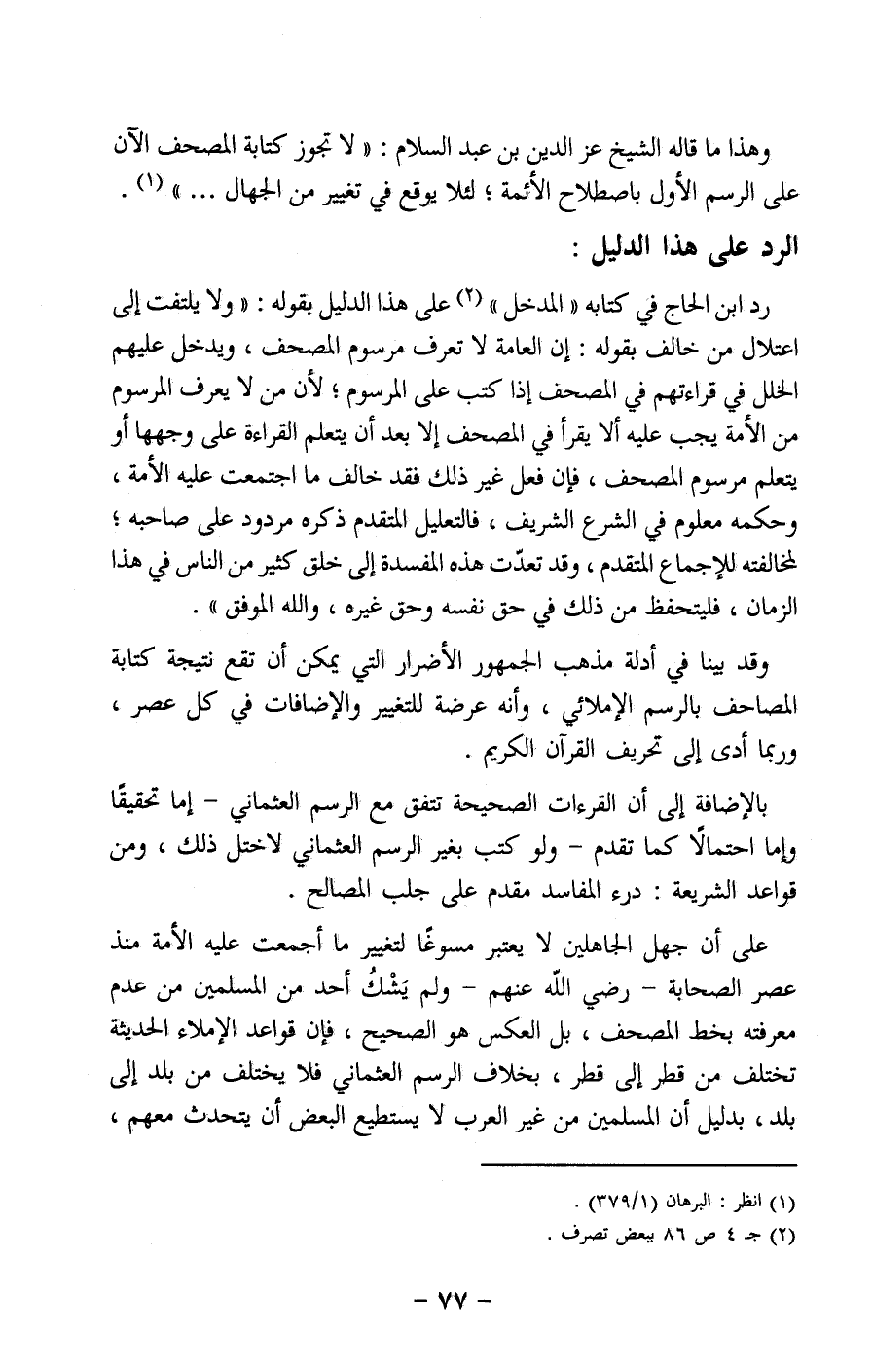 رد ابن الحاج في كتابه "المدخل"2 على هذا الدليل بقوله: "ولا يلتفت إلى اعتلال من خالف بقوله: إن العامة لا تعرف مرسوم المصحف، ويدخل عليهم الخلل في قراءتهم في المصحف إذا كتب على المرسوم، لأن من لا يعرف المرسوم من الأمة يجب عليه ألا يقرأ في المصحف إلا بعد أن يتعلم القراءة على وجهها أو يتعلم مرسوم المصحف، فإن فعل غير ذلك فقد خالف ما اجتمعت عليه الأمة، وحكمه معلوم في الشرع الشريف، فالتعليل المتقدم ذكره مردود على صاحبه، لمخالفته للإجماع المتقدم، وقد تعدت هذه المفسدة إلى خلق كثير من الناس في هذا الزمان، فليتحفظ من ذلك في حق نفسه وحق غيره، والله الموفق".