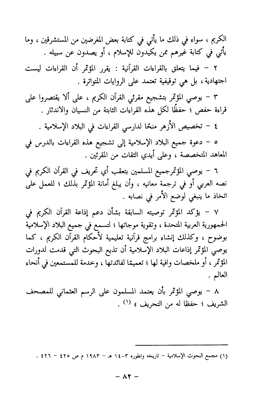 8- يوصي المؤتمر بأن يعتمد المسلمون على الرسم العثماني للمصحف الشريف، حفظا له من التحريف"1.