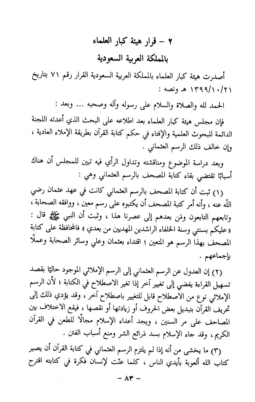 وبعد دراسة الموضوع ومناقشته وتداول الرأي فيه تبين للمجلس أن هناك أسبابا تقتضي بقاء كتابة المصحف بالرسم العثماني وهي: