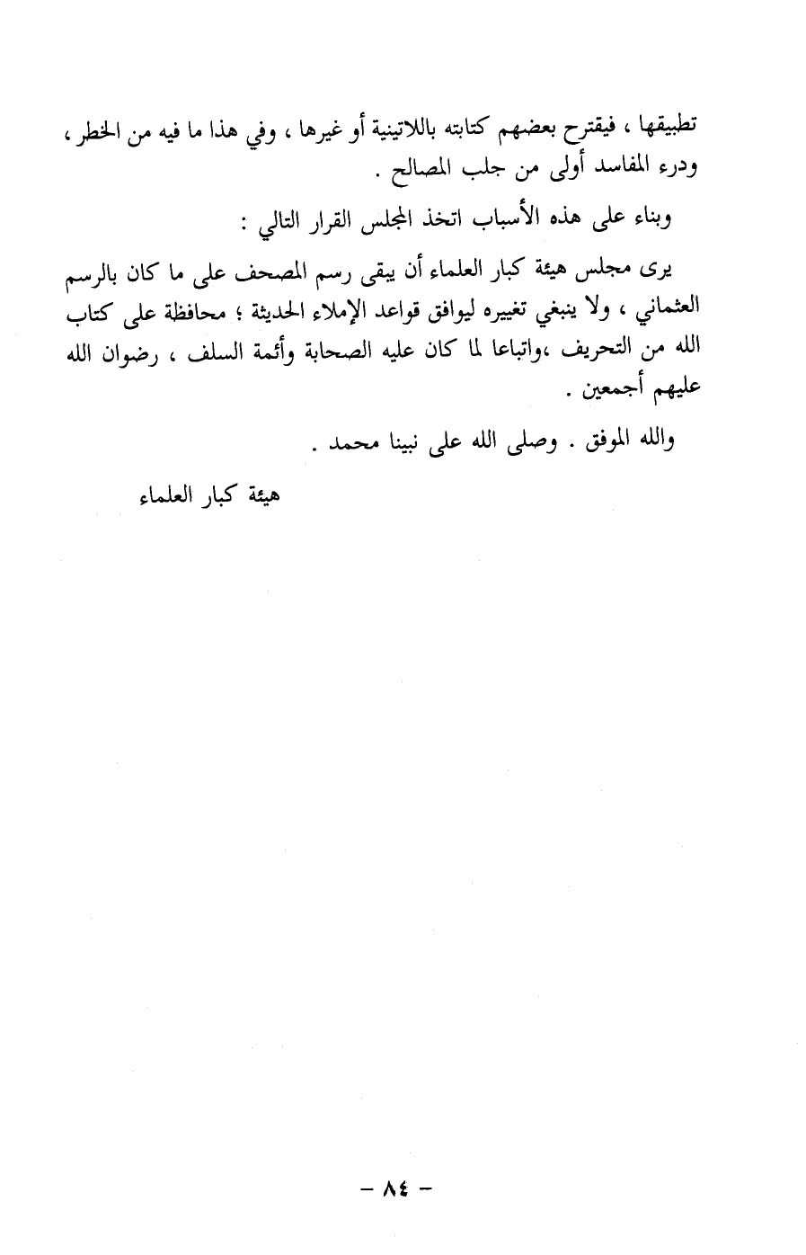 يرى مجلس هيئة كبار العلماء أن يبقى رسم المصحف على ما كان بالرسم العثماني، ولا ينبغي تغييره ليوافق قواعد الإملاء الحديثة، محافظة على كتاب الله من التحريف، واتباعا لما كان عليه الصحابة وأئمة السلف، رضوان الله عليهم أجمعين.