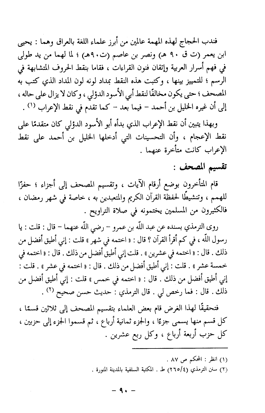 فتحقيقا لهذا الغرض قام بعض العلماء بتقسيم المصحف إلى ثلاثين قسما، كل قسم منها يسمى جزءا، والجزء ثمانية أرباع، ثم قسموا الجزء إلى حزبين، كل حزب أربعة أرباع، وكل ربع عشرين.