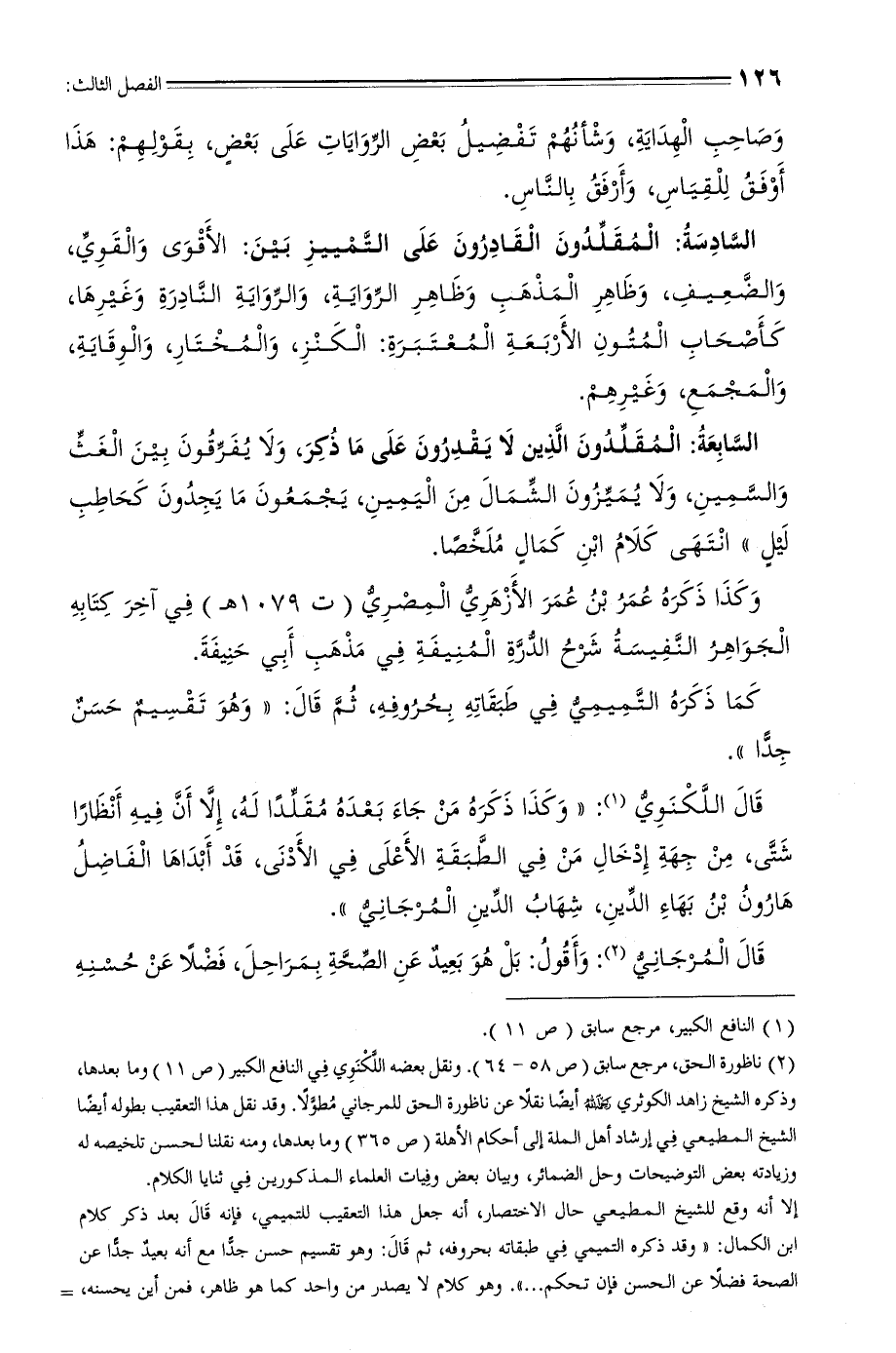 فمرتبة كتب الأصول الستة عندنا: كالصحيحين في الحديث، ومرتبة النوادر في مذهبنا: كالسنن الأربعة، والمحيط الرَّضَوِىّ: كالمصابيح والمشكاة، التي جمعت ما في الصحيحين، وما في السنن الأربعة، وغير ذلك مع التمييز.