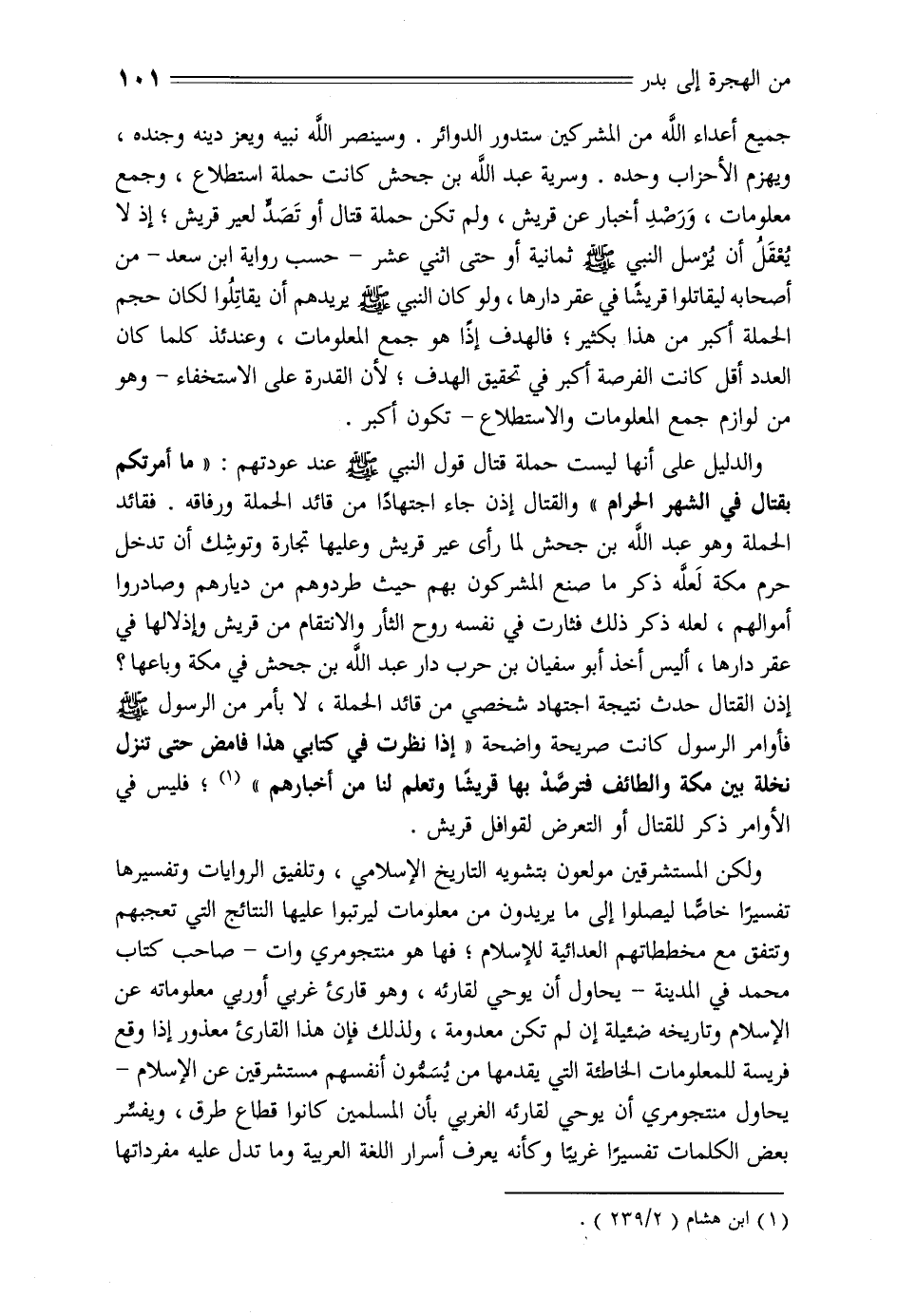 جميع أعداء الله من المشركين ستدور الدوائر. وسينصر الله نبيه ويعز دينه وجنده، ويهزم الأحزاب وحده. وسرية عبد الله بن جحش كانت حملة استطلاع، وجمع معلومات، ورصد أخبار عن قريش، ولم تكن حملة قتال أو تصدّ لعير قريش؛ إذ لا يعقل أن يرسل النبي صلّى الله عليه وسلم ثمانية أو حتى اثنى عشر- حسب رواية ابن سعد- من أصحابه ليقاتلوا قريشا في عقر دارها، ولو كان النبي صلّى الله عليه وسلم يريدهم أن يقاتلوا لكان حجم الحملة أكبر من هذا بكثير؛ فالهدف إذا هو جمع المعلومات، وعندئذ كلما كان العدد أقل كانت الفرصة أكبر في تحقيق الهدف؛ لأن القدرة على الاستخفاء- وهو من لوازم جمع المعلومات والاستطلاع- تكون أكبر.