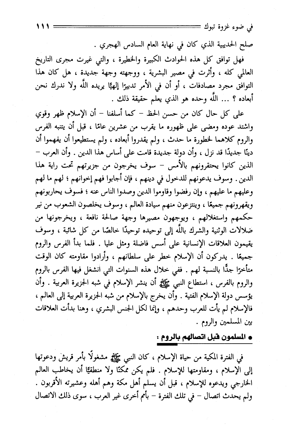 على كل حال كان من حسن الحظ- كما أسلفنا- أن الإسلام ظهر وقوي واشتد عوده ومضى على ظهوره ما يقرب من عشرين عاما، قبل أن يتنبه الفرس والروم كلاهما لخطورة ما حدث، ولم يقدروا أبعاده، ولم يستطيعوا أن يفهموا أن دينا جديدا قد نزل، وأن دولة جديدة قامت على أساس هذا الدين. وأن العرب- الذين كانوا يحتقرونهم بالأمس- سوف يخرجون من جزيرتهم تحت راية هذا الدين. وسوف يدعونهم للدخول في دينهم، فإن أجابوا فهم إخوانهم؛ لهم ما لهم وعليهم ما عليهم، وإن رفضوا وقاوموا الدين وصدوا الناس عنه؛ فسوف يحاربونهم ويقهرونهم جميعا، وينتزعون منهم سيادة العالم، وسوف يخلصون الشعوب من نير حكمهم واستغلالهم، ويوجهون مصيرها وجهة صالحة نافعة، ويخرجونها من ضلالات الوثنية والشرك بالله إلى توحيده توحيدا خالصا من كل شائبة، وسوف يقيمون العلاقات الإنسانية على أسس فاضلة ومثل عليا. فلما بدأ الفرس والروم جميعا. يدركون أن الإسلام خطر على سلطانهم، وأرادوا مقاومته كان الوقت متأخرا جدّا بالنسبة لهم. ففي خلال هذه السنوات التي انشغل فيها الفرس بالروم والروم بالفرس، استطاع النبي صلّى الله عليه وسلم أن ينشر الإسلام في شبه الجزيرة العربية. وأن يؤسس دولة الإسلام الفتية. وأن يخرج بالإسلام من شبه الجزيرة العربية إلى العالم، فالإسلام لم يأت للعرب وحدهم، وإنما لكل الجنس البشري، وهنا بدأت العلاقات بين المسلمين والروم.