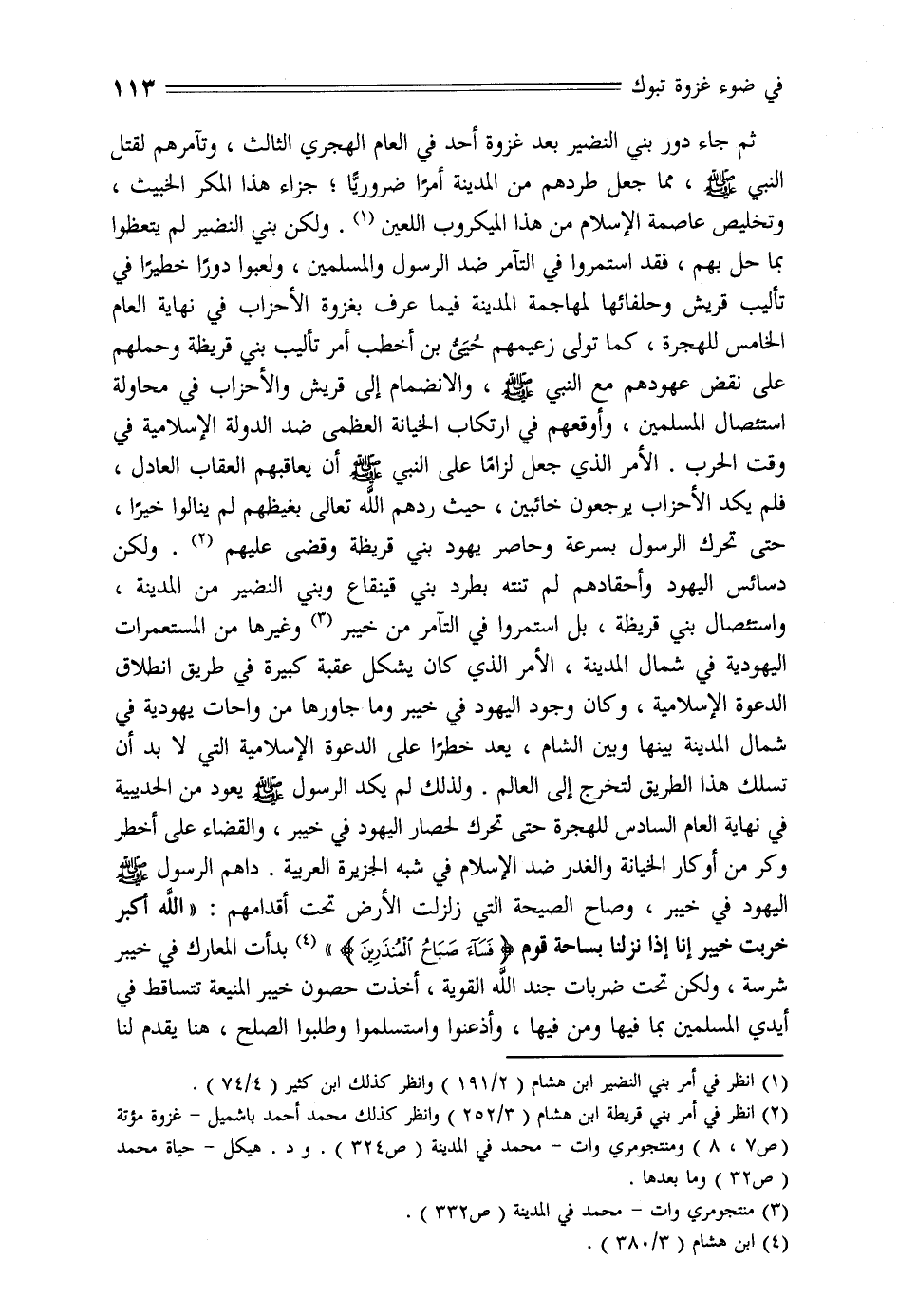 (2) انظر في أمر بني قريظة ابن هشام (3/ 252) وانظر كذلك محمد أحمد باشميل- غزوة مؤتة (ص 7، 8) ومنتجومري وات- محمد في المدينة (ص 324) . ود. هيكل- حياة محمد (ص 32) وما بعدها.