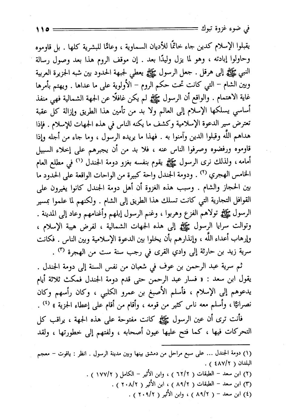 يقبلوا الإسلام كدين جاء خاتما للأديان السماوية، وعامّا للبشرية كلها. بل قاوموه وحاولوا إبادته، وهو لما يزل وليدا بعد. إن موقف الروم هذا بعد وصول رسالة النبي صلّى الله عليه وسلم إلى هرقل. جعل الرسول صلّى الله عليه وسلم يعطي لجبهة الحدود بين شبه الجزيرة العربية وبين الشام- التي كانت تحت حكم الروم- الأولوية على ما عداها. ويهتم بأمرها غاية الاهتمام. والواقع أن الرسول صلّى الله عليه وسلم لم يكن غافلا عن الجهة الشمالية فهي منفذ أساسي يسلكها الإسلام إلى العالم ولا بد من تأمين هذا الطريق وإزالة كل عقبة تعترض سير الدعوة الإسلامية وكشف ما يكنه الناس في هذه الجهات للإسلام. فإذا هداهم الله وقبلوا الدين وآمنوا به. فهذا ما يريده الرسول، وما جاء من أجله وإذا قاوموه ورفضوه وصرفوا الناس عنه، فلا بد من أن يجبرهم على إخلاء السبيل أمامه، ولذلك نرى الرسول صلّى الله عليه وسلم يقوم بنفسه بغزو دومة الجندل «1» في مطلع العام الخامس الهجري «2» . ودومة الجندل واحة كبيرة من الواحات الواقعة على الحدود ما بين الحجاز والشام. وسبب هذه الغزوة أن أهل دومة الجندل كانوا يغيرون على القوافل التجارية التي كانت تسلك هذا الطريق إلى الشام. ولكنهم لما علموا بمسير الرسول صلّى الله عليه وسلم تولاهم الفزع وهربوا، وغنم الرسول إبلهم وأغنامهم وعاد إلى المدينة.