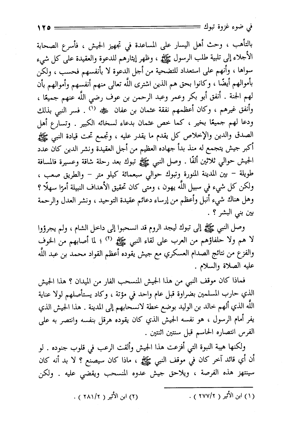 بالتأهب، وحث أهل اليسار على المساعدة في تجهيز الجيش، فأسرع الصحابة الأجلاء إلى تلبية طلب الرسول صلّى الله عليه وسلم، وظهر إيثارهم للدعوة والعقيدة على كل شيء سواها، وأنهم على استعداد للتضحية من أجل الدعوة لا بأنفسهم فحسب، ولكن بأموالهم أيضا، وكانوا بحق هم الذين اشترى الله تعالى منهم أنفسهم وأموالهم بأن لهم الجنة. أنفق أبو بكر وعمر وعبد الرحمن بن عوف رضي الله عنهم جميعا، وأنفق غيرهم، وكان أعظمهم نفقة عثمان بن عفان رضي الله عنه «1» . فسر النبي بذلك ودعا لهم جميعا بخير، كما خص عثمان بدعاء لسخائه الكبير. وتسارع أهل الصدق والدين والإخلاص كل يقدم ما يقدر عليه، وتجمع تحت قيادة النبي صلّى الله عليه وسلم أكبر جيش يتجمع له منذ بدأ جهاده العظيم من أجل العقيدة ونشر الدين كان عدد الجيش حوالي ثلاثين ألفا. وصل النبي صلّى الله عليه وسلم تبوك بعد رحلة شاقة وعسيرة فالمسافة طويلة- بين المدينة المنورة وتبوك حوالي سبعمائة كيلومتر- والطريق صعب، ولكن كل شيء في سبيل الله يهون، ومتى كان تحقيق الأهداف النبيلة أمرا سهلا؟