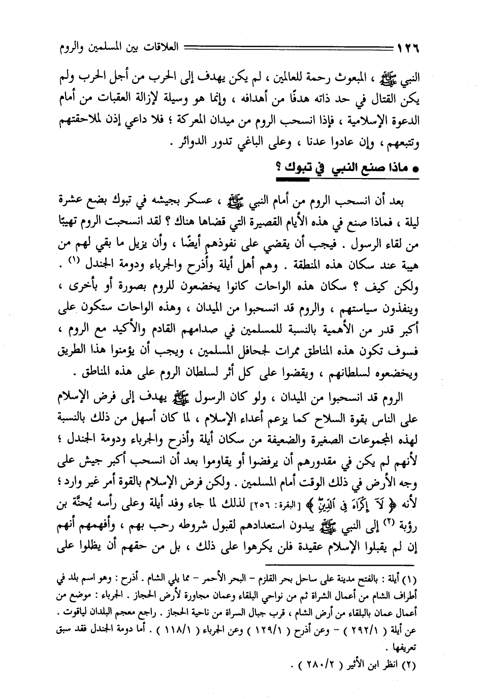 الروم قد انسحبوا من الميدان، ولو كان الرسول صلّى الله عليه وسلم يهدف إلى فرض الإسلام على الناس بقوة السلاح كما يزعم أعداء الإسلام، لما كان أسهل من ذلك بالنسبة لهذه المجموعات الصغيرة والضعيفة من سكان أيلة وأذرح والجرباء ودومة الجندل؛ لأنهم لم يكن في مقدورهم أن يرفضوا أو يقاوموا بعد أن انسحب أكبر جيش على وجه الأرض في ذلك الوقت أمام المسلمين. ولكن فرض الإسلام بالقوة أمر غير وارد؛ لأنه لا إِكْراهَ فِي الدِّينِ [البقرة: 256] لذلك لما جاء وفد أيلة وعلى رأسه يحنّة بن رؤبة «2» إلى النبي صلّى الله عليه وسلم يبدون استعدادهم لقبول شروطه رحب بهم، وأفهمهم أنهم إن لم يقبلوا الإسلام عقيدة فلن يكرهوا على ذلك، بل من حقهم أن يظلوا على
