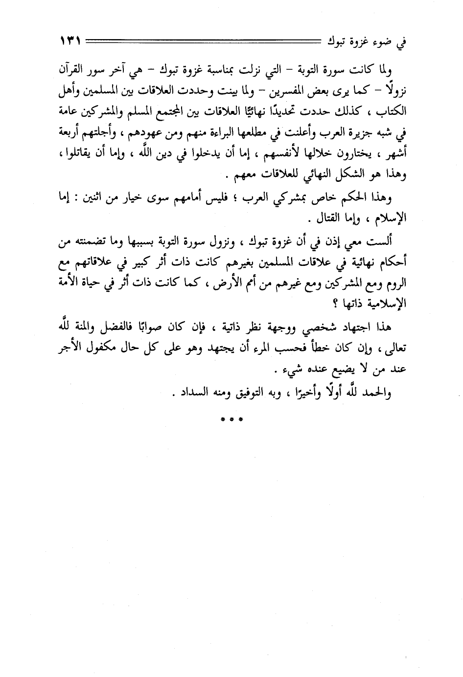 ولما كانت سورة التوبة- التي نزلت بمناسبة غزوة تبوك- هي آخر سور القرآن نزولا- كما يرى بعض المفسرين- ولما بينت وحددت العلاقات بين المسلمين وأهل الكتاب، كذلك حددت تحديدا نهائيّا العلاقات بين المجتمع المسلم والمشركين عامة في شبه جزيرة العرب وأعلنت في مطلعها البراءة منهم ومن عهودهم، وأجلتهم أربعة أشهر، يختارون خلالها لأنفسهم، إما أن يدخلوا في دين الله، وإما أن يقاتلوا، وهذا هو الشكل النهائي للعلاقات معهم.