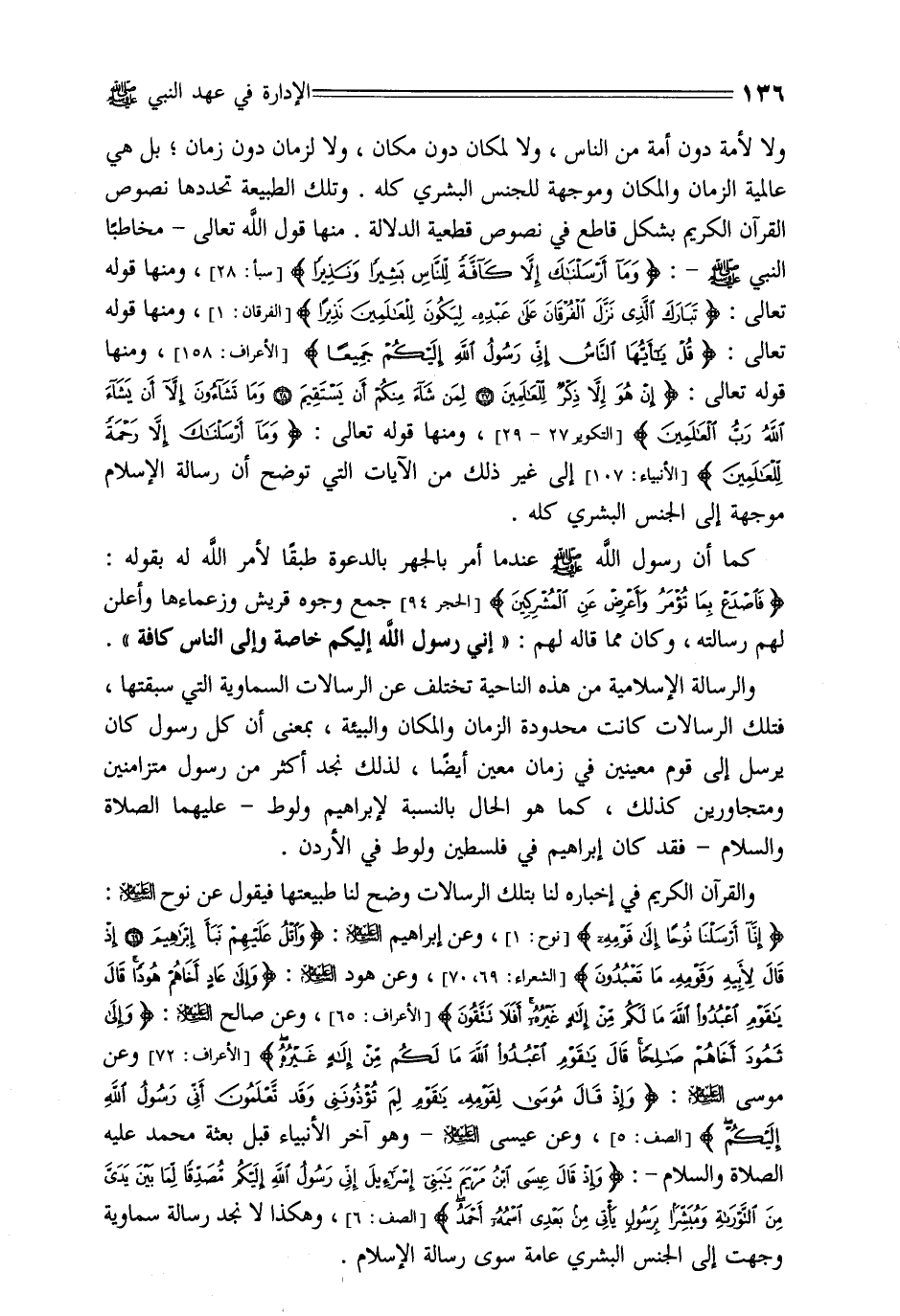 إِنَّا أَرْسَلْنا نُوحاً إِلى قَوْمِهِ [نوح: 1] ، وعن إبراهيم عليه السّلام: وَاتْلُ عَلَيْهِمْ نَبَأَ إِبْراهِيمَ (69) إِذْ قالَ لِأَبِيهِ وَقَوْمِهِ ما تَعْبُدُونَ [الشعراء: 69، 70] ، وعن هود عليه السّلام: وَإِلى عادٍ أَخاهُمْ هُوداً قالَ يا قَوْمِ اعْبُدُوا اللَّهَ ما لَكُمْ مِنْ إِلهٍ غَيْرُهُ أَفَلا تَتَّقُونَ [الأعراف: 65] ، وعن صالح عليه السّلام: وَإِلى ثَمُودَ أَخاهُمْ صالِحاً قالَ يا قَوْمِ اعْبُدُوا اللَّهَ ما لَكُمْ مِنْ إِلهٍ غَيْرُهُ [الأعراف: 72] وعن موسى عليه السّلام: وَإِذْ قالَ مُوسى لِقَوْمِهِ يا قَوْمِ لِمَ تُؤْذُونَنِي وَقَدْ تَعْلَمُونَ أَنِّي رَسُولُ اللَّهِ إِلَيْكُمْ [الصف: 5] ، وعن عيسى عليه السّلام- وهو آخر الأنبياء قبل بعثة محمد عليه الصلاة والسلام-: وَإِذْ قالَ عِيسَى ابْنُ مَرْيَمَ يا بَنِي إِسْرائِيلَ إِنِّي رَسُولُ اللَّهِ إِلَيْكُمْ مُصَدِّقاً لِما بَيْنَ يَدَيَّ مِنَ التَّوْراةِ وَمُبَشِّراً بِرَسُولٍ يَأْتِي مِنْ بَعْدِي اسْمُهُ أَحْمَدُ [الصف: 6] ، وهكذا لا نجد رسالة سماوية وجهت إلى الجنس البشري عامة سوى رسالة الإسلام.