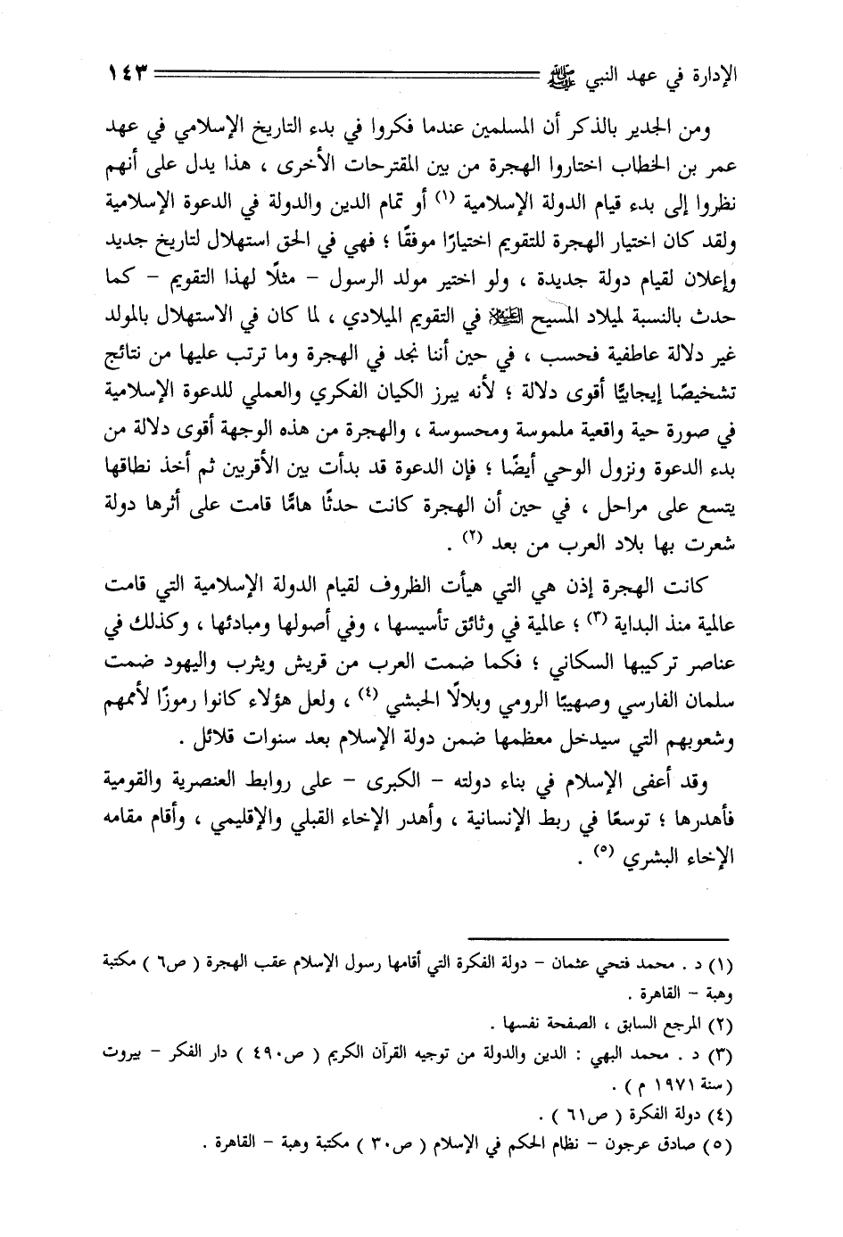 (1) د. محمد فتحي عثمان- دولة الفكرة التي أقامها رسول الإسلام عقب الهجرة (ص 6) مكتبة وهبة- القاهرة.