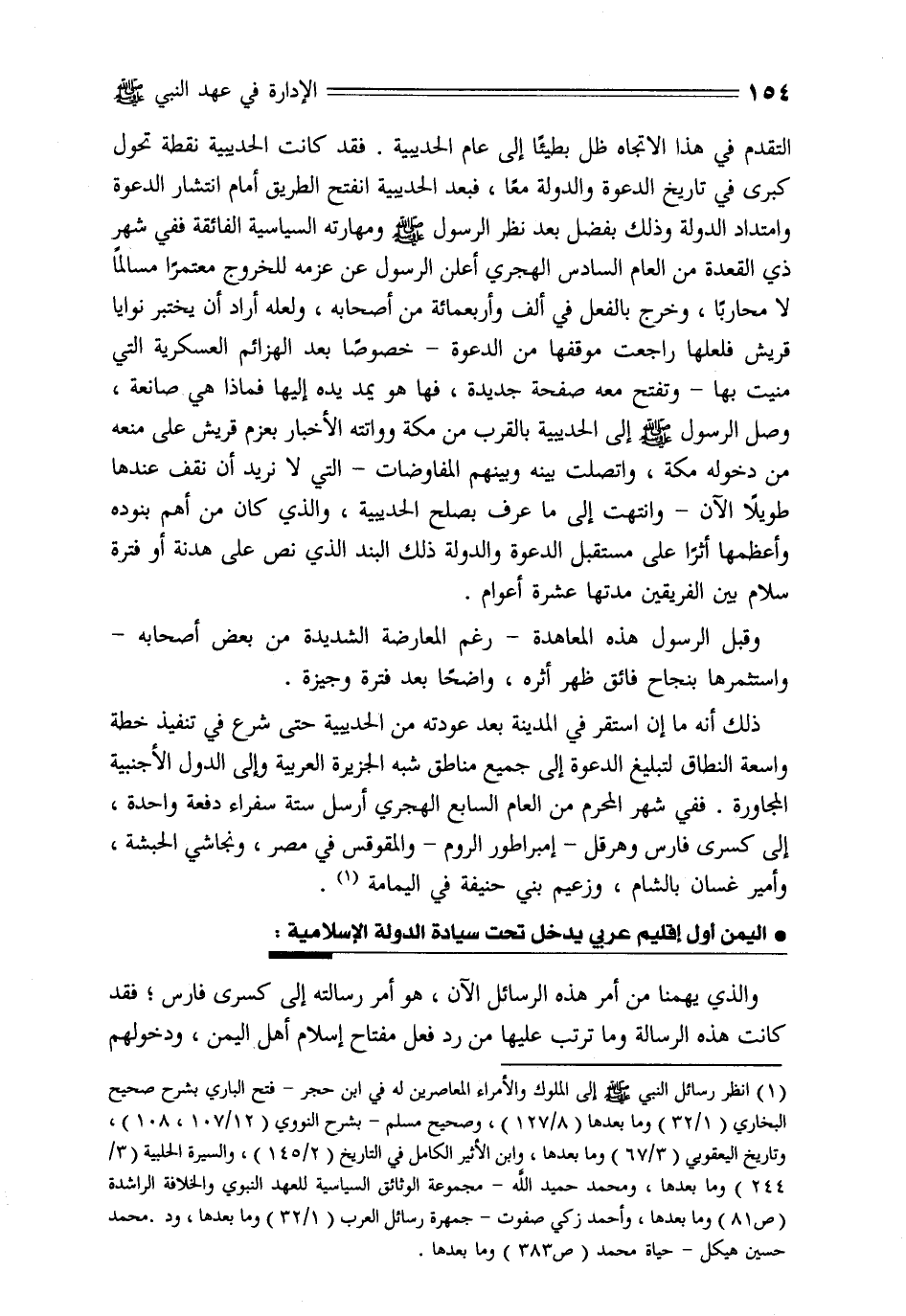 (1) انظر رسائل النبي صلّى الله عليه وسلم إلى الملوك والأمراء المعاصرين له في ابن حجر- فتح الباري بشرح صحيح البخاري (1/ 32) وما بعدها (8/ 127) ، وصحيح مسلم- بشرح النووي (12/ 107، 108) ، وتاريخ اليعقوبي (3/ 67) وما بعدها، وابن الأثير الكامل في التاريخ (2/ 145) ، والسيرة الحلبية (3/ 244) وما بعدها، ومحمد حميد الله- مجموعة الوثائق السياسية للعهد النبوي والخلافة الراشدة (ص 81) وما بعدها، وأحمد زكي صفوت- جمهرة رسائل العرب (1/ 32) وما بعدها، ود. محمد حسين هيكل- حياة محمد (ص 383) وما بعدها.
