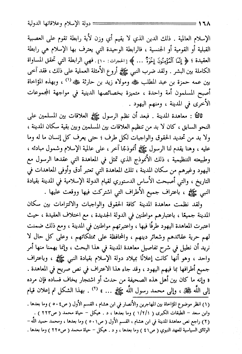 الإسلام العالمية. ذلك الدين الذي لا يقيم أي وزن لآية رابطة تقوم على العصبية القبلية أو القومية أو الجنسية، فالرابطة الوحيدة التي يعترف بها الإسلام هي رابطة العقيدة؛ إِنَّمَا الْمُؤْمِنُونَ إِخْوَةٌ ... [الحجرات: 10] . فهي الرابطة التي تحقق المساواة الكاملة بين البشر. ولقد ضرب النبي صلّى الله عليه وسلم أروع الأمثلة العملية على ذلك، فقد آخى بين عمه حمزة بن عبد المطلب رضي الله عنه ومولاه زيد بن حارثة رضي الله عنه «1» ، وبهذه المؤاخاة أصبح المسلمون أمة واحدة، متميزة بخصائصها الدينية في مواجهة المجموعات الآخرى في المدينة، ومنهم اليهود.