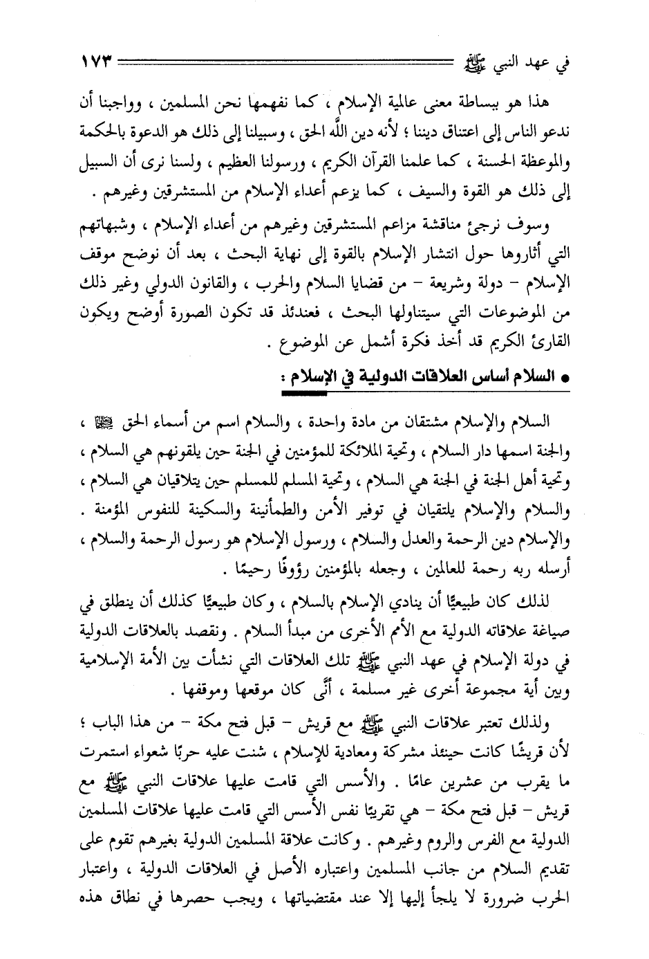 لذلك كان طبيعيّا أن ينادي الإسلام بالسلام، وكان طبيعيّا كذلك أن ينطلق في صياغة علاقاته الدولية مع الأمم الآخرى من مبدأ السلام. ونقصد بالعلاقات الدولية في دولة الإسلام في عهد النبي صلّى الله عليه وسلم تلك العلاقات التي نشأت بين الأمة الإسلامية وبين أية مجموعة أخرى غير مسلمة، أنّى كان موقعها وموقفها.