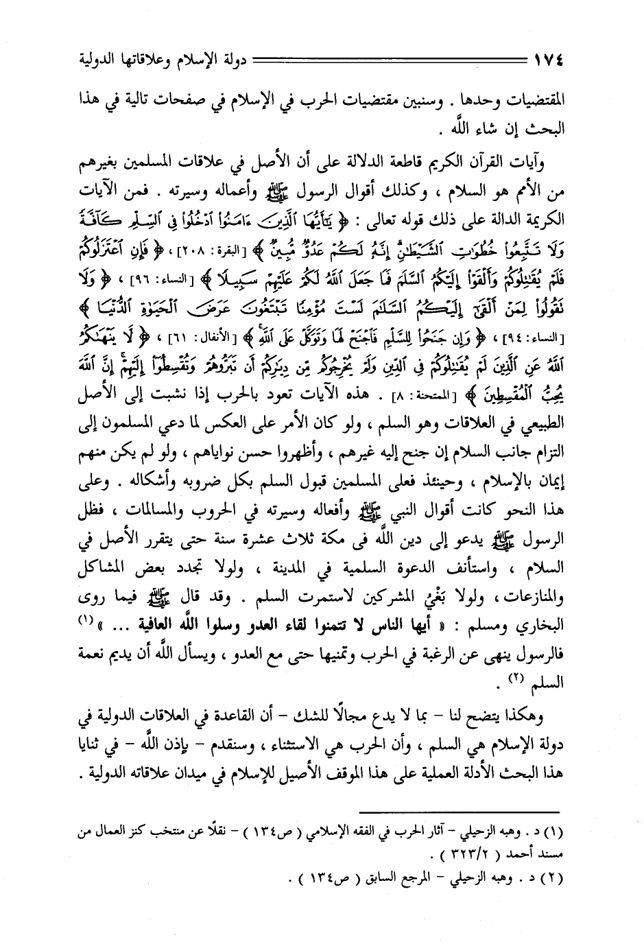 وهكذا يتضح لنا- بما لا يدع مجالا للشك- أن القاعدة في العلاقات الدولية في دولة الإسلام هي السلم، وأن الحرب هي الاستثناء، وسنقدم- بإذن الله- في ثنايا هذا البحث الأدلة العملية على هذا الموقف الأصيل للإسلام في ميدان علاقاته الدولية.