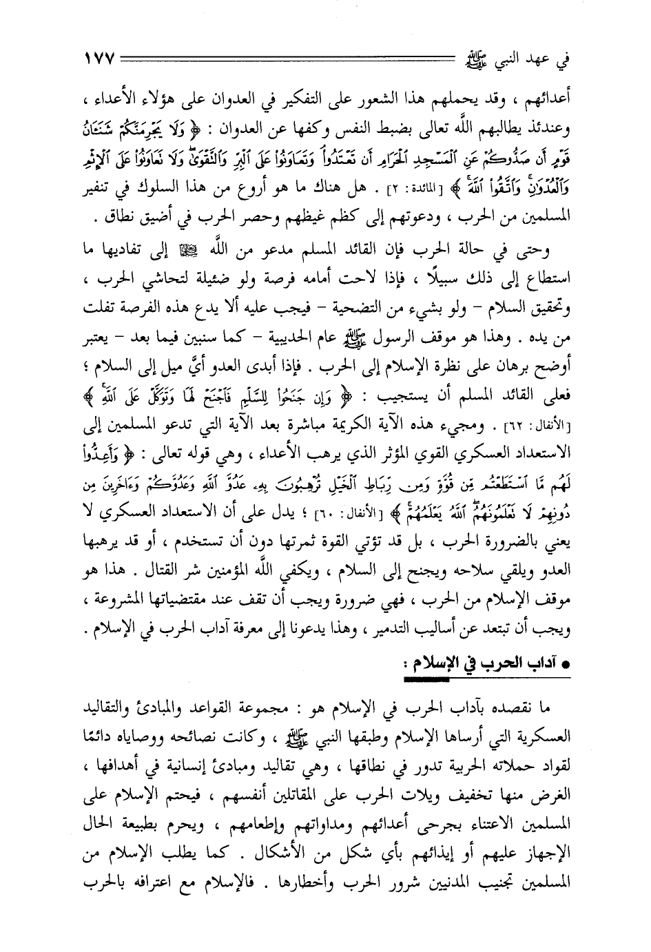 وحتى في حالة الحرب فإن القائد المسلم مدعو من الله سبحانه وتعالى إلى تفاديها ما استطاع إلى ذلك سبيلا، فإذا لاحت أمامه فرصة ولو ضئيلة لتحاشي الحرب، وتحقيق السلام- ولو بشيء من التضحية- فيجب عليه ألا يدع هذه الفرصة تفلت من يده. وهذا هو موقف الرسول صلّى الله عليه وسلم عام الحديبية- كما سنبين فيما بعد- يعتبر أوضح برهان على نظرة الإسلام إلى الحرب. فإذا أبدى العدو أيّ ميل إلى السلام؛ فعلى القائد المسلم أن يستجيب: وَإِنْ جَنَحُوا لِلسَّلْمِ فَاجْنَحْ لَها وَتَوَكَّلْ عَلَى اللَّهِ [الأنفال: 62] . ومجيء هذه الآية الكريمة مباشرة بعد الآية التي تدعو المسلمين إلى الاستعداد العسكري القوي المؤثر الذي يرهب الأعداء، وهي قوله تعالى: وَأَعِدُّوا لَهُمْ مَا اسْتَطَعْتُمْ مِنْ قُوَّةٍ وَمِنْ رِباطِ الْخَيْلِ تُرْهِبُونَ بِهِ عَدُوَّ اللَّهِ وَعَدُوَّكُمْ وَآخَرِينَ مِنْ دُونِهِمْ لا تَعْلَمُونَهُمُ اللَّهُ يَعْلَمُهُمْ [الأنفال: 60] ؛ يدل على أن الاستعداد العسكري لا يعني بالضرورة الحرب، بل قد تؤتي القوة ثمرتها دون أن تستخدم، أو قد يرهبها العدو ويلقي سلاحه ويجنح إلى السلام، ويكفي الله المؤمنين شر القتال. هذا هو موقف الإسلام من الحرب، فهي ضرورة ويجب أن تقف عند مقتضياتها المشروعة، ويجب أن تبتعد عن أساليب التدمير، وهذا يدعونا إلى معرفة آداب الحرب في الإسلام.