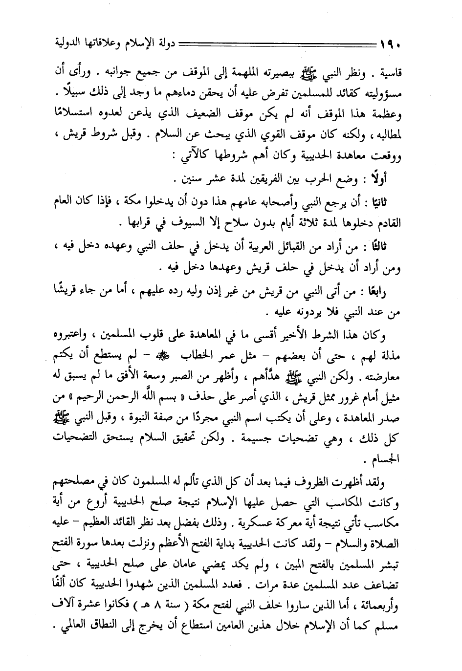 وكان هذا الشرط الأخير أقسى ما في المعاهدة على قلوب المسلمين، واعتبروه مذلة لهم، حتى أن بعضهم- مثل عمر الخطاب رضي الله عنه- لم يستطع أن يكتم معارضته. ولكن النبي صلّى الله عليه وسلم هدّأهم، وأظهر من الصبر وسعة الأفق ما لم يسبق له مثيل أمام غرور ممثل قريش، الذي أصر على حذف «بسم الله الرحمن الرحيم» من صدر المعاهدة، وعلى أن يكتب اسم النبي مجردا من صفة النبوة، وقبل النبي صلّى الله عليه وسلم كل ذلك، وهي تضحيات جسيمة. ولكن تحقيق السلام يستحق التضحيات الجسام.