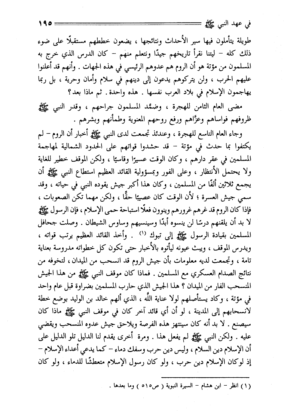 وجاء العام التاسع للهجرة، وعندئذ تجمعت لدى النبي صلّى الله عليه وسلم أخبار أن الروم- لم يكتفوا بما حدث في مؤتة- قد حشدوا قواتهم على الحدود الشمالية لمهاجمة المسلمين في عقر دارهم، وكان الوقت عسيرا وقاسيا، ولكن الموقف خطير للغاية ولا يحتمل الأنتظار، وعلى الفور وبمسؤولية القائد العظيم استطاع النبي صلّى الله عليه وسلم أن يجمع ثلاثين ألفا من المسلمين، وكان هذا أكبر جيش يقوده النبي في حياته، وقد سمي جيش العسرة؛ لأن الوقت كان عصيبا حقّا، ولكن مهما تكن الصعوبات، فإذا كان الروم قد غرهم غرورهم وينوون فعلا استباحة حمى الإسلام، فإن الرسول صلّى الله عليه وسلم لا بد أن يلقنهم درسا لن ينسوه أبدا وسينسيهم وساوس الشيطان. وصلت جحافل المسلمين بقيادة الرسول صلّى الله عليه وسلم إلى تبوك «1» . وأخذ القائد العظيم يرتب قواته، ويدرس الموقف، ويبث عيونه ليأتوه بالأخبار حتى تكون كل خطواته مدروسة بعناية تامة، وتجمعت لديه معلومات بأن جيش الروم قد انسحب من الميدان، لتخوفه من نتائج الصدام العسكري مع المسلمين. فماذا كان موقف النبي صلّى الله عليه وسلم من هذا الجيش المنسحب الفار من الميدان؟ هذا الجيش الذي حارب المسلمين بضراوة قبل عام واحد في مؤتة، وكاد يستأصلهم لولا عناية الله، الذي ألهم خالد بن الوليد بوضع خطة لانسحابهم إلى المدينة، لو أن أي قائد آخر كان في موقف النبي صلّى الله عليه وسلم ماذا كان سيصنع. لا بد أنه كان سينتهز هذه الفرصة ويلاحق جيش عدوه المنسحب ويقضي عليه. ولكن النبي صلّى الله عليه وسلم لم يفعل هذا. ومرة أخرى يقدم لنا الدليل تلو الدليل على أن الإسلام دين السلام، وليس دين حرب وسفك دماء- كما يدعي أعداء الإسلام- إذ لو كان الإسلام دين حرب، ولو كان رسول الإسلام متعطشا للدماء، ولو كان