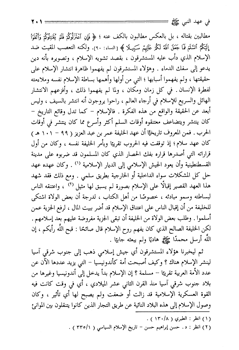 مطالبين بقتاله، بل بالعكس مطالبون بالكف عنه؛ فَإِنِ اعْتَزَلُوكُمْ فَلَمْ يُقاتِلُوكُمْ وَأَلْقَوْا إِلَيْكُمُ السَّلَمَ فَما جَعَلَ اللَّهُ لَكُمْ عَلَيْهِمْ سَبِيلًا [النساء: 90] . ولكنه التعصب المقيت ضد الإسلام الذي دأب عليه المستشرقون، بقصد تشويه الإسلام، وتصويره بأنه دين يدعو إلى سفك الدماء. وهؤلاء المستشرقون لم يفهموا ظاهرة انتشار الإسلام على حقيقتها، ولم يفهموا أسبابها؛ التي من أولها وأهمها بساطة الإسلام نفسه وملاءمته لفطرة الإنسان. في كل زمان ومكان، ولما لم يفهموا ذلك، وأفزعهم الانتشار الهائل والسريع للإسلام في أرجاء العالم، راحوا يروجون أنه انتشر بالسيف، وليس أبعد عن الحقيقة والواقع من هذه الفكرة. فالإسلام- كما تدل وقائع التاريخ- كان ينتشر ويتضاعف معتنقوه أوقات السلم أكثر وأسرع مما كان ينتشر في أوقات الحرب. فمن المعروف تاريخيّا أن عهد الخليفة عمر بن عبد العزيز (99- 101 هـ) كان عهد سلام؛ إذ توقفت فيه الحروب تقريبا وبأمر الخليفة نفسه، وكان من أول قراراته التي أصدرها قراره بفك الحصار الذي كان المسلمون قد ضربوه على مدينة القسطنطينية وأن يعود الجيش الإسلامي إلى الديار الإسلامية «1» . وكان عهده عهد حل كل المشكلات سواء الداخلية أو الخارجية بطريق سلمي. ومع ذلك فقد شهد هذا العهد القصير إقبالا على الإسلام بصورة لم يسبق لها مثيل «2» ، واعتنقه الناس لبساطته وسمو مبادئه، خصوصا من أهل الكتاب، لدرجة أن بعض الولاة اشتكى للخليفة من أن إقبال الناس على اعتناق الإسلام قد أضر ببيت المال، لرفع الجزية عمن أسلموا. وطلب بعض الولاة من الخليفة أن تبقى الجزية مفروضة عليهم بعد إسلامهم.