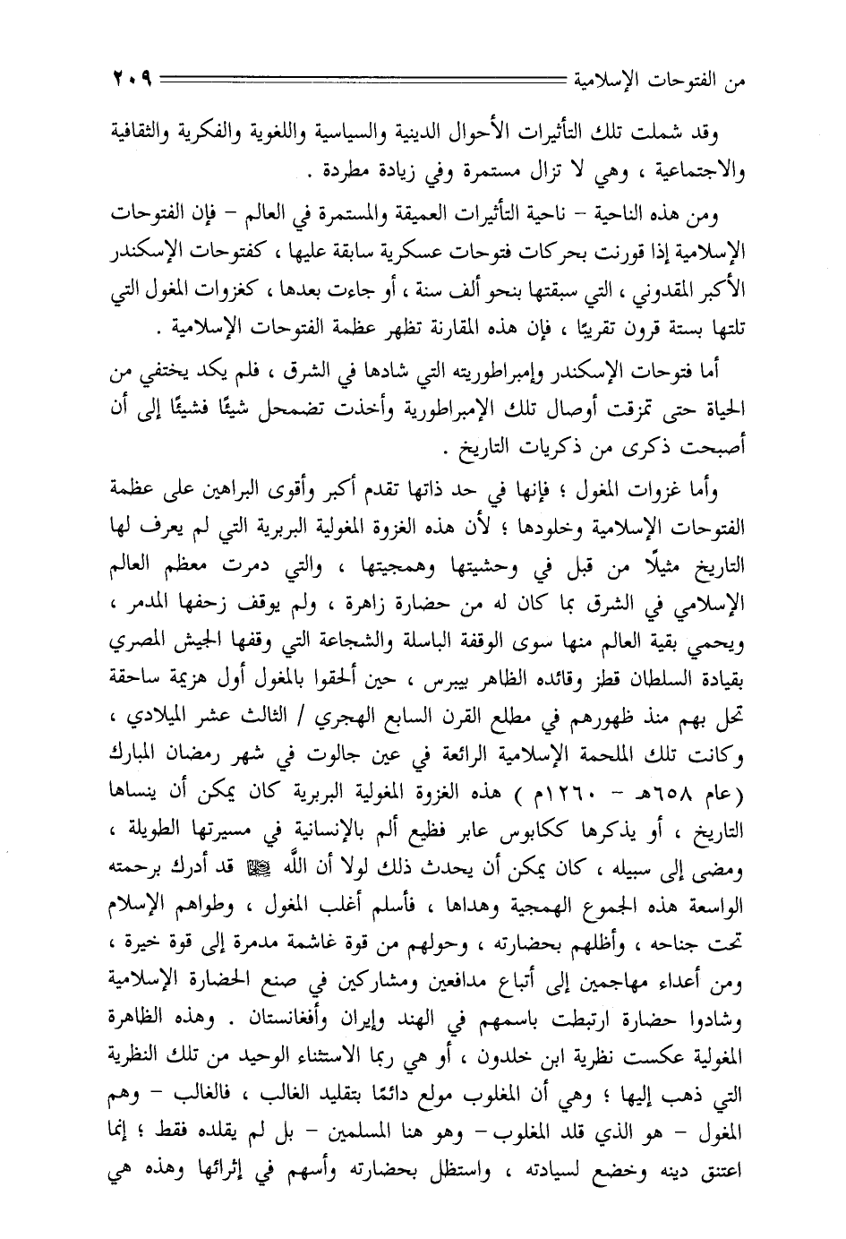 وأما غزوات المغول؛ فإنها في حد ذاتها تقدم أكبر وأقوى البراهين على عظمة الفتوحات الإسلامية وخلودها؛ لأن هذه الغزوة المغولية البربرية التي لم يعرف لها التاريخ مثيلا من قبل في وحشيتها وهمجيتها، والتي دمرت معظم العالم الإسلامي في الشرق بما كان له من حضارة زاهرة، ولم يوقف زحفها المدمر، ويحمي بقية العالم منها سوى الوقفة الباسلة والشجاعة التي وقفها الجيش المصري بقيادة السلطان قطز وقائده الظاهر بيبرس، حين ألحقوا بالمغول أول هزيمة ساحقة تحل بهم منذ ظهورهم في مطلع القرن السابع الهجري/ الثالث عشر الميلادي، وكانت تلك الملحمة الإسلامية الرائعة في عين جالوت في شهر رمضان المبارك (عام 658 هـ- 1260 م) هذه الغزوة المغولية البربرية كان يمكن أن ينساها التاريخ، أو يذكرها ككابوس عابر فظيع ألم بالإنسانية في مسيرتها الطويلة، ومضى إلى سبيله، كان يمكن أن يحدث ذلك لولا أن الله سبحانه وتعالى قد أدرك برحمته الواسعة هذه الجموع الهمجية وهداها، فأسلم أغلب المغول، وطواهم الإسلام تحت جناحه، وأظلهم بحضارته، وحولهم من قوة غاشمة مدمرة إلى قوة خيرة، ومن أعداء مهاجمين إلى أتباع مدافعين ومشاركين في صنع الحضارة الإسلامية وشادوا حضارة ارتبطت باسمهم في الهند وإيران وأفغانستان. وهذه الظاهرة المغولية عكست نظرية ابن خالدون، أو هي ربما الاستثناء الوحيد من تلك النظرية التي ذهب إليها؛ وهي أن المغلوب مولع دائما بتقليد الغالب، فالغالب- وهم المغول- هو الذي قلد المغلوب- وهو هنا المسلمين- بل لم يقلده فقط؛ إنما اعتنق دينه وخضع لسيادته، واستظل بحضارته وأسهم في إثرائها وهذه هي