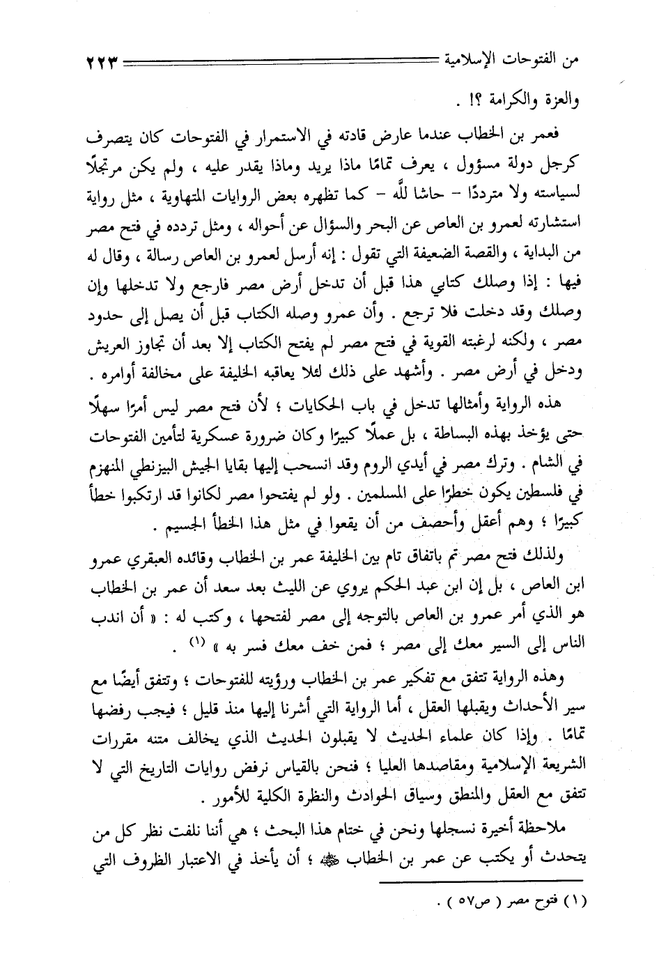 فعمر بن الخطاب عند ما عارض قادته في الاستمرار في الفتوحات كان يتصرف كرجل دولة مسؤول، يعرف تماما ماذا يريد وماذا يقدر عليه، ولم يكن مرتجلا لسياسته ولا مترددا- حاشا لله- كما تظهره بعض الروايات المتهاوية، مثل رواية استشارته لعمرو بن العاص عن البحر والسؤال عن أحواله، ومثل تردده في فتح مصر من البداية، والقصة الضعيفة التي تقول: إنه أرسل لعمرو بن العاص رسالة، وقال له فيها: إذا وصلك كتابي هذا قبل أن تدخل أرض مصر فارجع ولا تدخلها وإن وصلك وقد دخلت فلا ترجع. وأن عمرو وصله الكتاب قبل أن يصل إلى حدود مصر، ولكنه لرغبته القوية في فتح مصر لم يفتح الكتاب إلا بعد أن تجاوز العريش ودخل في أرض مصر. وأشهد على ذلك لئلا يعاقبه الخليفة على مخالفة أوامره.