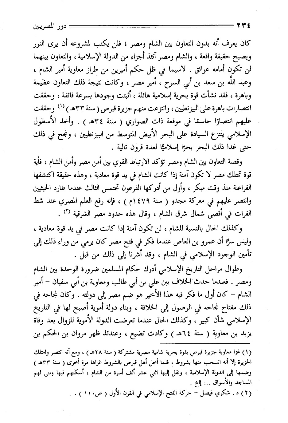 وكذلك الحال بالنسبة للشام، لن تكون آمنة إذا كانت مصر في يد قوة معادية، وليس سرّا أن عمرو بن العاص عند ما فكر في فتح مصر كان يرمي من وراء ذلك إلى تأمين الوجود الإسلامي في الشام، وقد أشرنا إلى ذلك من قبل.