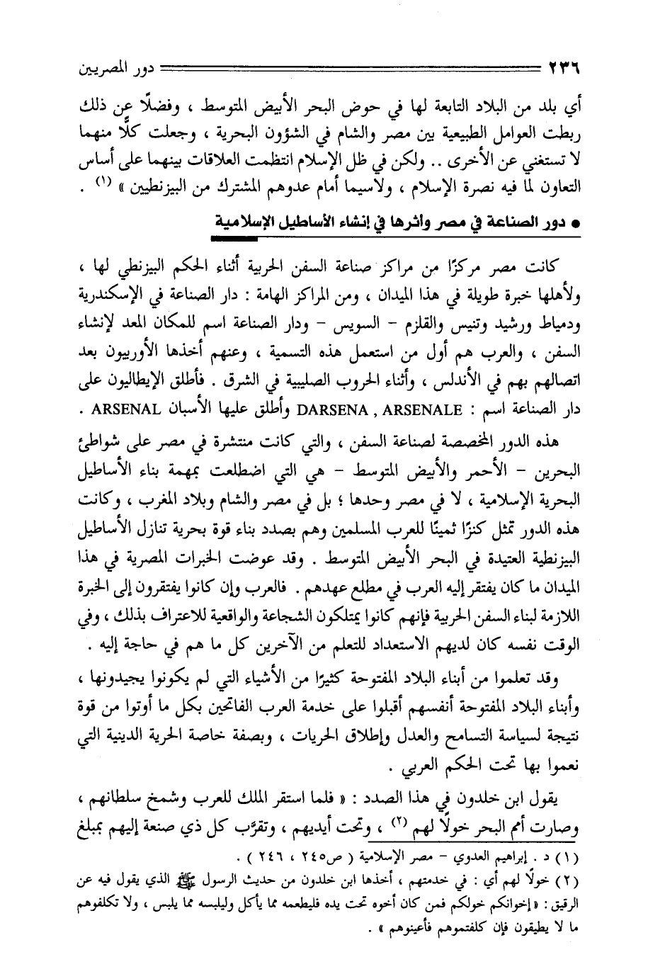 أي بلد من البلاد التابعة لها في حوض البحر الأبيض المتوسط، وفضلا عن ذلك ربطت العوامل الطبيعية بين مصر والشام في الشؤون البحرية، وجعلت كلّا منهما لا تستغني عن الآخرى.. ولكن في ظل الإسلام انتظمت العلاقات بينهما على أساس التعاون لما فيه نصرة الإسلام، ولا سيما أمام عدوهم المشترك من البيزنطيين» «1» .