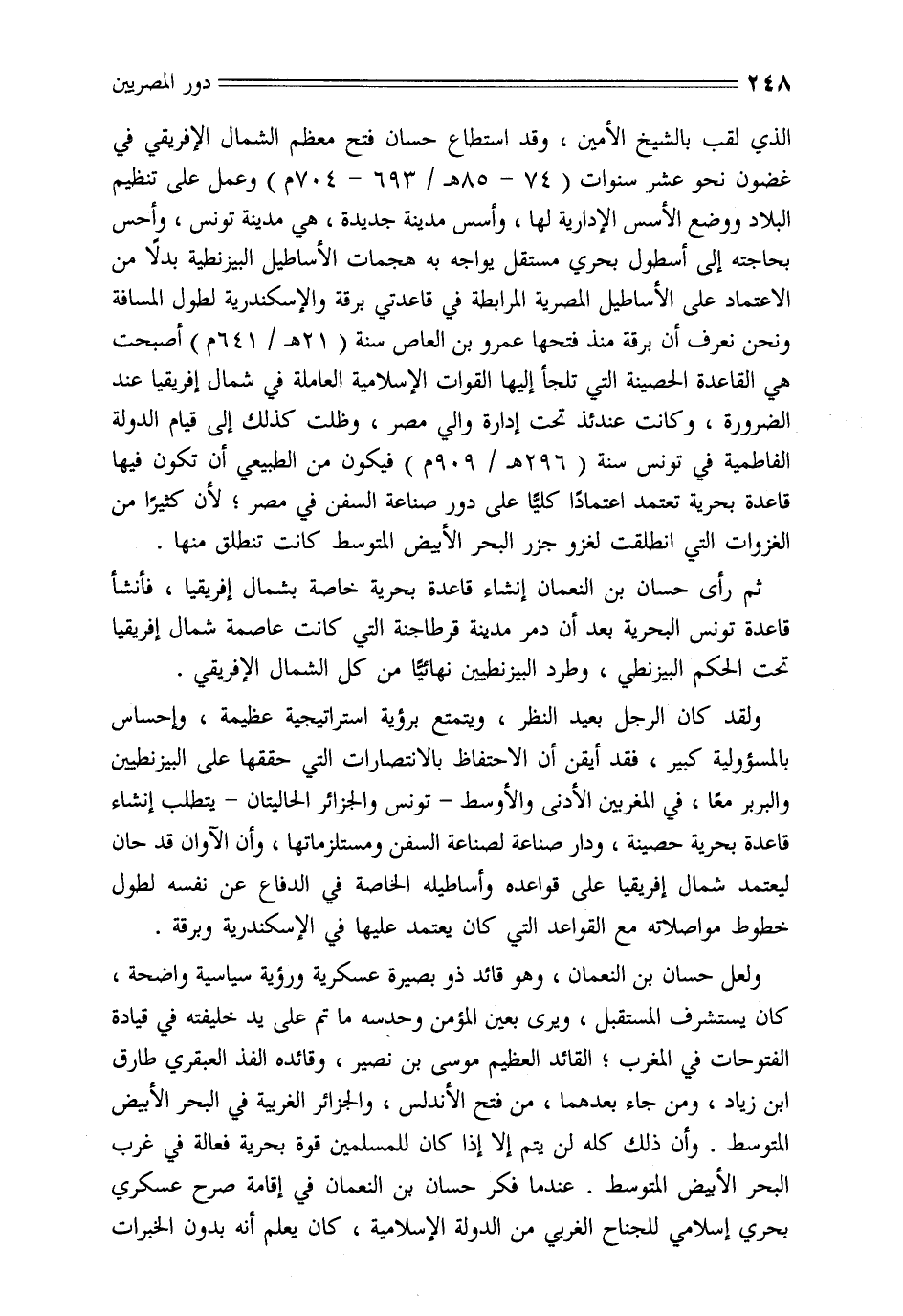 الذي لقب بالشيخ الأمين، وقد استطاع حسان فتح معظم الشمال الإفريقي في غضون نحو عشر سنوات (74- 85 هـ/ 693- 704 م) وعمل على تنظيم البلاد ووضع الأسس الإدارية لها، وأسس مدينة جديدة، هي مدينة تونس، وأحس بحاجته إلى أسطول بحري مستقل يواجه به هجمات الأساطيل البيزنطية بدلا من الاعتماد على الأساطيل المصرية المرابطة في قاعدتي برقة والإسكندرية لطول المسافة ونحن نعرف أن برقة منذ فتحها عمرو بن العاص سنة (21 هـ/ 641 م) أصبحت هي القاعدة الحصينة التي تلجأ إليها القوات الإسلامية العاملة في شمال إفريقيا عند الضرورة، وكانت عندئذ تحت إدارة والي مصر، وظلت كذلك إلى قيام الدولة الفاطمية في تونس سنة (296 هـ/ 909 م) فيكون من الطبيعي أن تكون فيها قاعدة بحرية تعتمد اعتمادا كليّا على دور صناعة السفن في مصر؛ لأن كثيرا من الغزوات التي انطلقت لغزو جزر البحر الأبيض المتوسط كانت تنطلق منها.