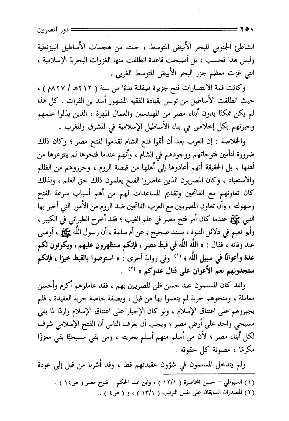 والخلاصة: إن العرب بعد أن أتموا فتح الشام تقدموا لفتح مصر؛ وكان ذلك ضرورة لتأمين فتوحاتهم ووجودهم في الشام، وأنهم عندما فتحوها لم ينتزعوها من أهلها، بل الحقيقة أنهم أعادوها إلى أهلها من قبضة الروم، وحرروهم من الظلم والاستعباد، وكان المصريون الذين عاصروا الفتح يعلمون ذلك حق العلم، ولذلك كان تعاونهم مع الفاتحين وتقديم المساعدات لهم من أهم أسباب سرعة الفتح وسهولته، وأن تعاون المصريين مع العرب الفاتحين ضد الروم من الأمور التي أخبر بها النبي صلّى الله عليه وسلم عندما كان أمر فتح مصر في علم الغيب؛ فقد أخرج الطبراني في الكبير، وأبو نعيم في دلائل النبوة، بسند صحيح، عن أم سلمة، أن رسول الله صلّى الله عليه وسلم، أوصى عند وفاته، فقال: «الله الله في قبط مصر، فإنكم ستظهرون عليهم، ويكونون لكم عدة وأعوانا في سبيل الله» «1» وفي رواية أخرى: «استوصوا بالقبط خيرا، فإنكم ستجدونهم نعم الأعوان على قتال عدوكم» «2» .