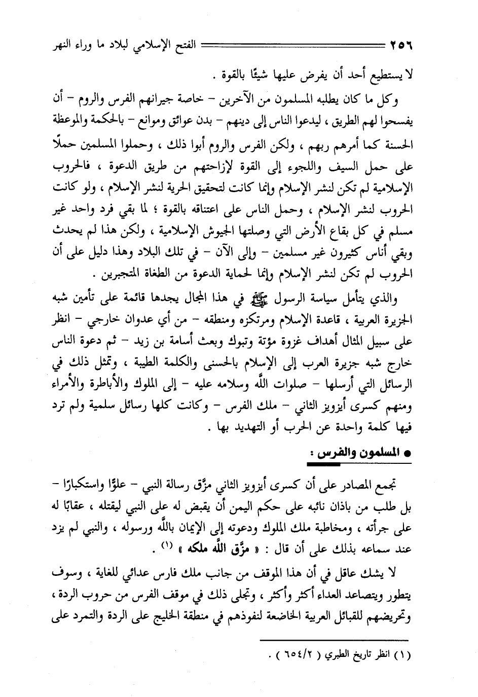 وكل ما كان يطلبه المسلمون من الآخرين- خاصة جيرانهم الفرس والروم- أن يفسحوا لهم الطريق، ليدعوا الناس إلى دينهم- بدن عوائق وموانع- بالحكمة والموعظة الحسنة كما أمرهم ربهم، ولكن الفرس والروم أبوا ذلك، وحملوا المسلمين حملا على حمل السيف واللجوء إلى القوة لإزاحتهم من طريق الدعوة، فالحروب الإسلامية لم تكن لنشر الإسلام وإنما كانت لتحقيق الحرية لنشر الإسلام، ولو كانت الحروب لنشر الإسلام، وحمل الناس على اعتناقه بالقوة؛ لما بقي فرد واحد غير مسلم في كل بقاع الأرض التي وصلتها الجيوش الإسلامية، ولكن هذا لم يحدث وبقي أناس كثيرون غير مسلمين- وإلى الآن- في تلك البلاد وهذا دليل على أن الحروب لم تكن لنشر الإسلام وإنما لحماية الدعوة من الطغاة المتجبرين.