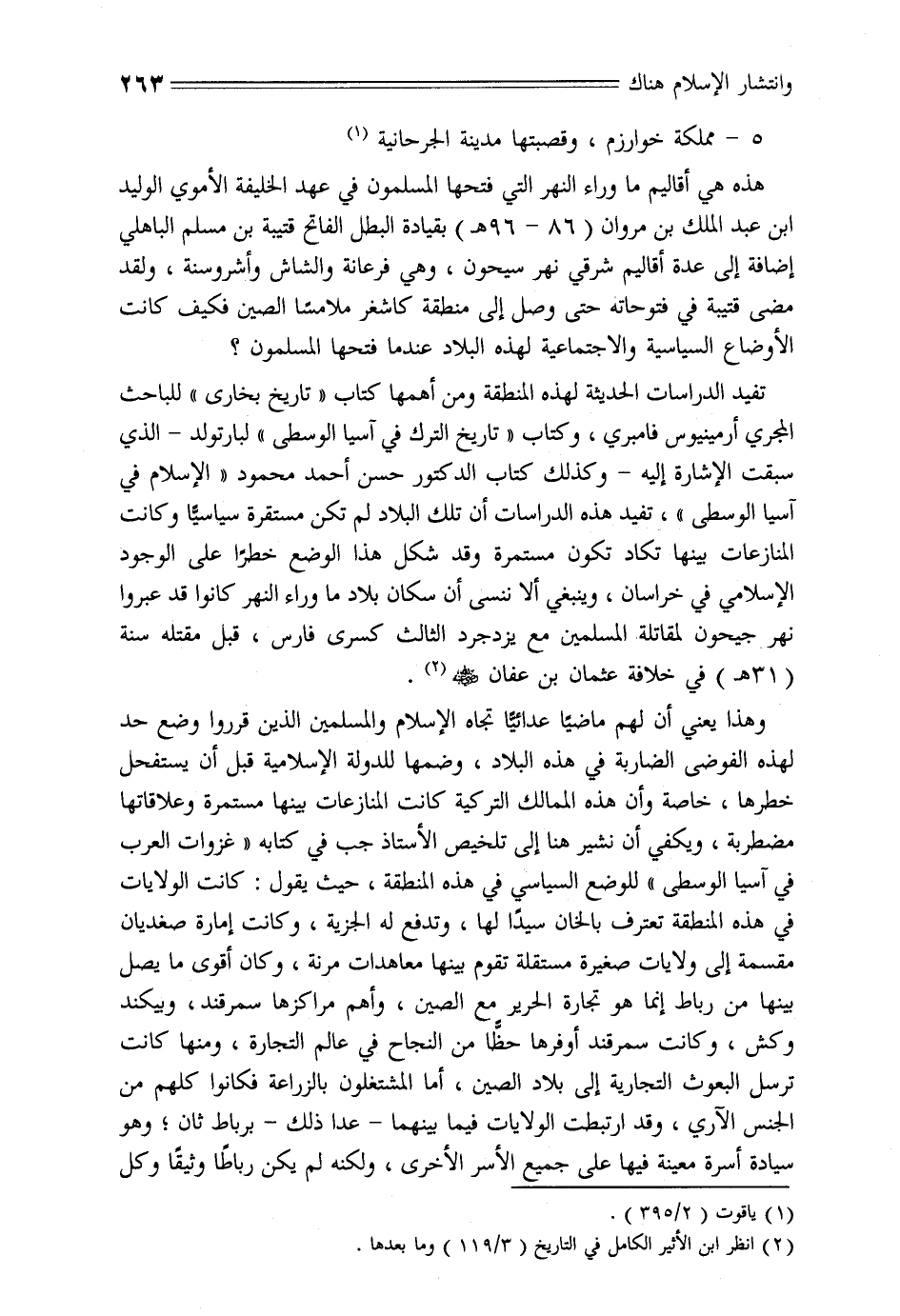 وهذا يعني أن لهم ماضيا عدائيّا تجاه الإسلام والمسلمين الذين قرروا وضع حد لهذه الفوضى الضاربة في هذه البلاد، وضمها للدولة الإسلامية قبل أن يستفحل خطرها، خاصة وأن هذه الممالك التركية كانت المنازعات بينها مستمرة وعلاقاتها مضطربة، ويكفي أن نشير هنا إلى تلخيص الأستاذ جب في كتابه «غزوات العرب في آسيا الوسطى» للوضع السياسي في هذه المنطقة، حيث يقول: كانت الولايات في هذه المنطقة تعترف بالخان سيدا لها، وتدفع له الجزية، وكانت إمارة صغديان مقسمة إلى ولايات صغيرة مستقلة تقوم بينها معاهدات مرنة، وكان أقوى ما يصل بينها من رباط إنما هو تجارة الحرير مع الصين، وأهم مراكزها سمرقند، وبيكند وكش، وكانت سمرقند أوفرها حظّا من النجاح في عالم التجارة، ومنها كانت ترسل البعوث التجارية إلى بلاد الصين، أما المشتغلون بالزراعة فكانوا كلهم من الجنس الآري، وقد ارتبطت الولايات فيما بينهما- عدا ذلك- برباط ثان؛ وهو سيادة أسرة معينة فيها على جميع الأسر الآخرى، ولكنه لم يكن رباطا وثيقا وكل