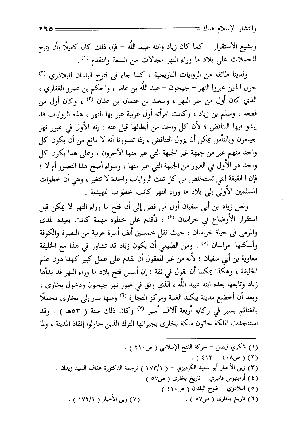 ولدينا طائفة من الروايات التاريخية، كما جاء في فتوح البلدان للبلاذري «2» حول الذين عبروا النهر- جيحون- عبد الله بن عامر، والحكم بن عمرو الغفاري، الذي كان أول من عبر النهر، وسعيد بن عثمان بن عفان «3» ، وكان أول من قطعه، وسلم بن زياد، وكانت امرأته أول عربية عبر بها النهر، هذه الروايات قد يبدو فيها التناقض؛ لأن كل واحد من أبطالها قيل عنه: إنه الأول في عبور نهر جيحون وبالتأمل يمكن أن يزول التناقض، إذا تصورنا أنه لا مانع من أن يكون كل واحد منهم عبر من جبهة غير الجبهة التي عبر منها الآخرون، وعلى هذا يكون كل واحد هو الأول في العبور من الجبهة التي عبر منها، وسواء أصح هذا التصور أم لا؛ فإن الحقيقة التي تستخلص من كل تلك الروايات واحدة لا تتغير، وهي أن خطوات المسلمين الأولى إلى بلاد ما وراء النهر كانت خطوات تمهيدية.