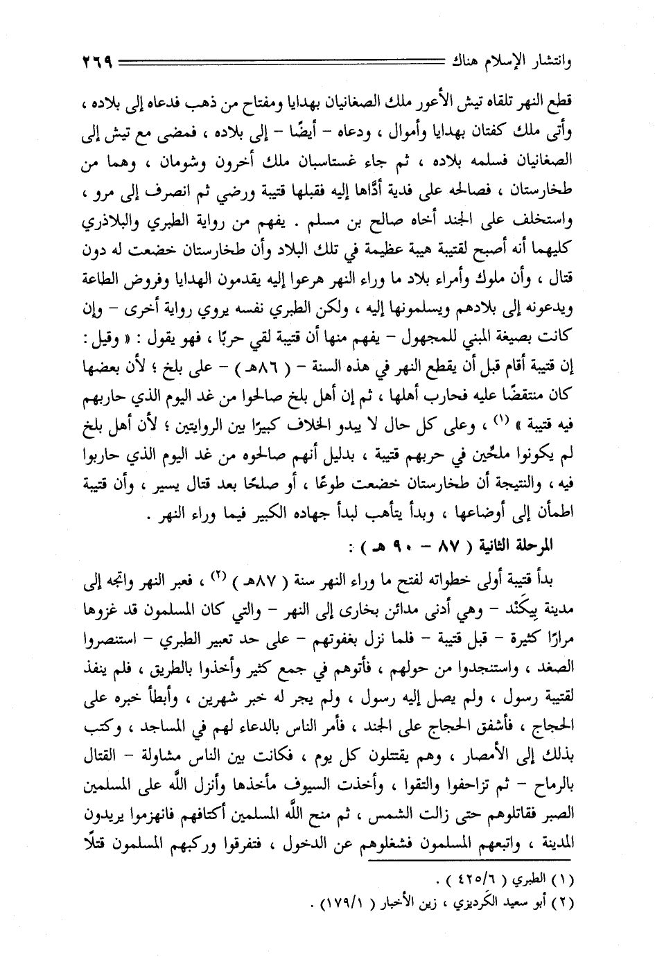 إن قتيبة أقام قبل أن يقطع النهر في هذه السنة- (86 هـ) - على بلخ؛ لأن بعضها كان منتقضا عليه فحارب أهلها، ثم إن أهل بلخ صالحوا من غد اليوم الذي حاربهم فيه قتيبة» «1» ، وعلى كل حال لا يبدو الخلاف كبيرا بين الروايتين؛ لأن أهل بلخ لم يكونوا ملحّين في حربهم قتيبة، بدليل أنهم صالحوه من غد اليوم الذي حاربوا فيه، والنتيجة أن طخارستان خضعت طوعا، أو صلحا بعد قتال يسير، وأن قتيبة اطمأن إلى أوضاعها، وبدأ يتأهب لبدأ جهاده الكبير فيما وراء النهر.