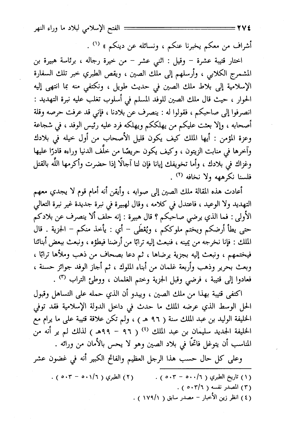 اكتفى قتيبة بهذا من ملك الصين، ويبدو أن الذي حمله على التساهل وقبول الحل الوسط الذي عرضه الملك ما حدث في داخل الدولة الإسلامية فقد توفي الخليفة الوليد بن عبد الملك سنة (96 هـ) ، ولم تكن علاقة قتيبة على ما يرام مع الخليفة الجديد سليمان بن عبد الملك «4» (96- 99 هـ) لذلك لم ير أنه من المناسب أن يتوغل فاتحا في بلاد الصين وهو لا يحس بالأمان من ورائه.