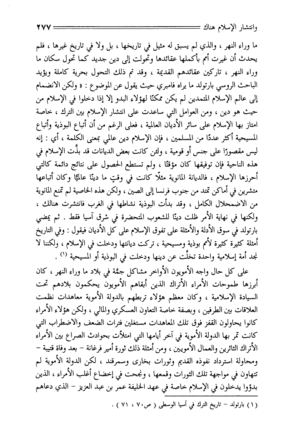 ما وراء النهر، والذي لم يسبق له مثيل في تاريخها، بل ولا في تاريخ غيرها، فلم يحدث أن غيرت أمم بأكملها عقائدها وتحولت إلى دين جديد كما تحول سكان ما وراء النهر، تاركين عقائدهم القديمة، وقد تم ذلك التحول بحرية كاملة ويؤيد الباحث الروسي بارتولد ما يراه فامبري حيث يقول عن الموضوع: «ولكن الانضمام إلى عالم الإسلام المتمدين لم يكن ممكنا لهؤلاء البدو إلا إذا دخلوا في الإسلام من حيث هو دين، ومن العوامل التي ساعدت على انتشار الإسلام بين الترك، خاصة امتاز بها الإسلام على سائر الأديان العالمية، فعلى الرغم من أن أتباع البوذية وأتباع المسيحية أكثر عددا من المسلمين، فإن الإسلام دين عالمي بمعنى الكلمة، أي: إنه ليس مقصورا على جنس أو قومية، ولئن كانت بعض الديانات قد بذّت الإسلام في هذه الناحية فإن توفيقها كان مؤقتا، ولم تستطع الحصول على نتائج دائمة كالتي أحرزها الإسلام، فالديانة المانوية مثلا كانت في وقت ما دينا عالميّا وكان أتباعها متشرين في أماكن تمتد من جنوب فرنسا إلى الصين، ولكن هذه الخاصية لم تمنع المانوية من الاضمحلال الكامل، وقد بدأت البوذية نشاطها في الغرب فانتشرت هنالك، ولكنها في نهاية الأمر ظلت دينا للشعوب المتحضرة في شرق آسيا فقط. ثم يمضي بارتولد في سوق الأدلة والأمثلة على تفوق الإسلام على كل الأديان فيقول: وفي التاريخ أمثلة كثيرة كثيرة لأمم بوذية ومسيحية، تركت ديانتها ودخلت في الإسلام، ولكننا لا نجد أمة إسلامية واحدة تخلّت عن دينها ودخلت في البوذية أو المسيحية «1» .
