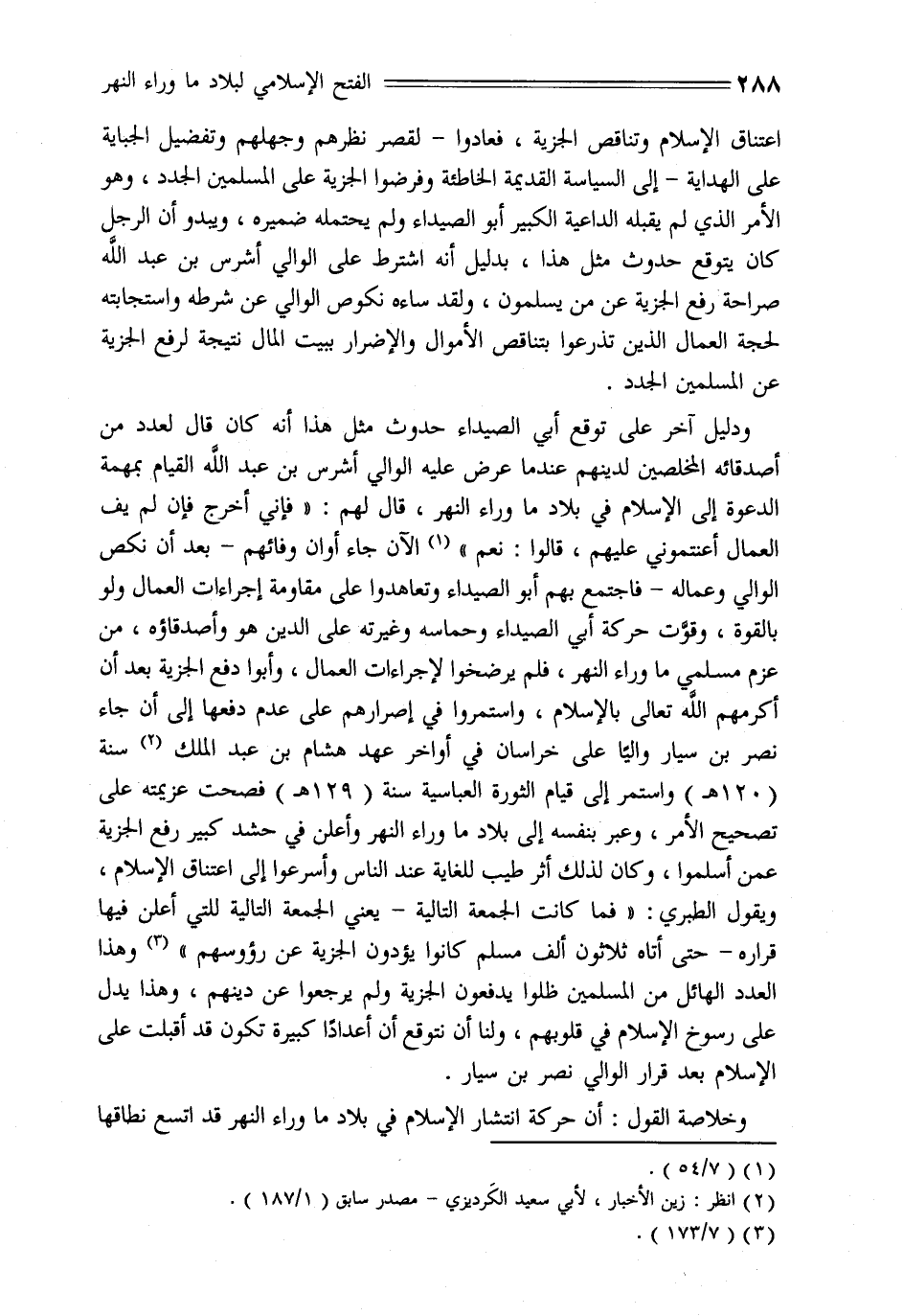 ودليل آخر على توقع أبي الصيداء حدوث مثل هذا أنه كان قال لعدد من أصدقائه المخلصين لدينهم عند ما عرض عليه الوالي أشرس بن عبد الله القيام بمهمة الدعوة إلى الإسلام في بلاد ما وراء النهر، قال لهم: «فإني أخرج فإن لم يف العمال أعنتموني عليهم، قالوا: نعم» «1» الآن جاء أوان وفائهم- بعد أن نكص الوالي وعماله- فاجتمع بهم أبو الصيداء وتعاهدوا على مقاومة إجراآت العمال ولو بالقوة، وقوّت حركة أبي الصيداء وحماسه وغيرته على الدين هو وأصدقاؤه، من عزم مسلمي ما وراء النهر، فلم يرضخوا لإجراآت العمال، وأبوا دفع الجزية بعد أن أكرمهم الله تعالى بالإسلام، واستمروا في إصرارهم على عدم دفعها إلى أن جاء نصر بن سيار واليا على خراسان في أواخر عهد هشام بن عبد الملك «2» سنة (120 هـ) واستمر إلى قيام الثورة العباسية سنة (129 هـ) فصحت عزيمته على تصحيح الأمر، وعبر بنفسه إلى بلاد ما وراء النهر وأعلن في حشد كبير رفع الجزية عمن أسلموا، وكان لذلك أثر طيب للغاية عند الناس وأسرعوا إلى اعتناق الإسلام، ويقول الطبري: «فما كانت الجمعة التالية- يعني الجمعة التالية للتي أعلن فيها قراره- حتى أتاه ثلاثون ألف مسلم كانوا يؤدون الجزية عن رؤوسهم» «3» وهذا العدد الهائل من المسلمين ظلوا يدفعون الجزية ولم يرجعوا عن دينهم، وهذا يدل على رسوخ الإسلام في قلوبهم، ولنا أن نتوقع أن أعدادا كبيرة تكون قد أقبلت على الإسلام بعد قرار الوالي نصر بن سيار.