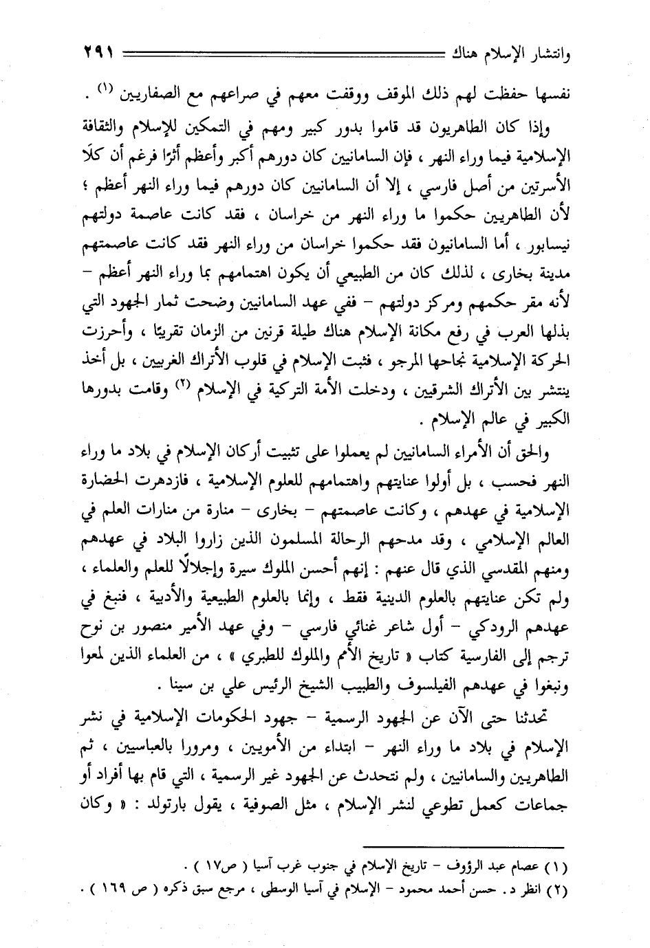 وإذا كان الطاهريون قد قاموا بدور كبير ومهم في التمكين للإسلام والثقافة الإسلامية فيما وراء النهر، فإن السامانيين كان دورهم أكبر وأعظم أثرا فرغم أن كلا الأسرتين من أصل فارسي، إلا أن السامانيين كان دورهم فيما وراء النهر أعظم؛ لأن الطاهريين حكموا ما وراء النهر من خراسان، فقد كانت عاصمة دولتهم نيسابور، أما السامانيون فقد حكموا خراسان من وراء النهر فقد كانت عاصمتهم مدينة بخارى، لذلك كان من الطبيعي أن يكون اهتمامهم بما وراء النهر أعظم- لأنه مقر حكمهم ومركز دولتهم- ففي عهد السامانيين وضحت ثمار الجهود التي بذلها العرب في رفع مكانة الإسلام هناك طيلة قرنين من الزمان تقريبا، وأحرزت الحركة الإسلامية نجاحها المرجو، فثبت الإسلام في قلوب الأتراك الغربيين، بل أخذ ينتشر بين الأتراك الشرقيين، ودخلت الأمة التركية في الإسلام «2» وقامت بدورها الكبير في عالم الإسلام.