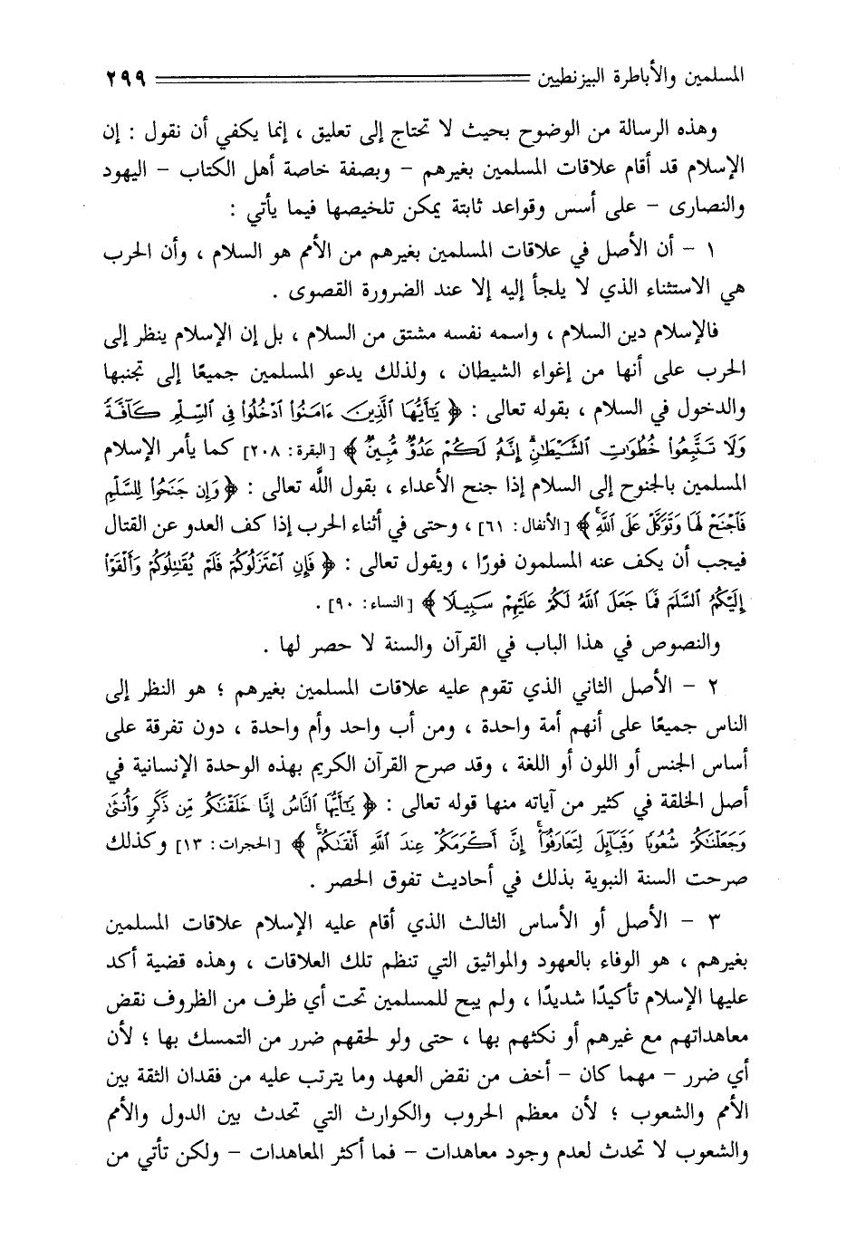 وهذه الرسالة من الوضوح بحيث لا تحتاج إلى تعليق، إنما يكفي أن نقول: إن الإسلام قد أقام علاقات المسلمين بغيرهم- وبصفة خاصة أهل الكتاب- اليهود والنصارى- على أسس وقواعد ثابتة يمكن تلخيصها فيما يأتي: