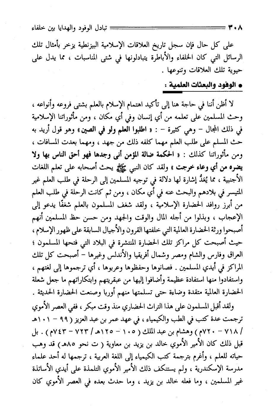 لا أظن أننا في حاجة هنا إلى تأكيد اهتمام الإسلام بالعلم بشتى فروعه وأنواعه، وحث المسلمين على تعلمه من أي إنسان وفي أي مكان، ومن مأثوراتنا الإسلامية في ذلك المجال- وهي كثيرة-: «اطلبوا العلم ولو في الصين» وهو قول أريد به حث المسلم على طلب العلم مهما كلفه ذلك من جهد، ومهما بعدت المسافات، ومن مأثوراتنا كذلك: «الحكمة ضالة المؤمن أنى وجدها فهو أحق الناس بها ولا يضره من أي وعاء خرجت» ولقد كان النبي صلّى الله عليه وسلم يحث أصحابه على تعلم اللغات الأجنبية، مما يعدّ إشارة لها دلالة في توجيه المسلمين إلى الرحلة في طلب العلم غير المتيسر في بلادهم والبحث عنه في أي مكان، ومن ثم كانت الرحلة في طلب العلم من أبرز روافد الحضارة الإسلامية، ولقد شغف المسلمون بالعلم شغفا يدعو إلى الإعجاب، وبذلوا من أجله المال والوقت والجهد ومن حسن حظ المسلمين أنهم أصبحوا ورثة الحضارة العالمية التي خلفتها القرون والأجيال السابقة على ظهور الإسلام، حيث أصبحت كل مراكز تلك الحضارة المنتشرة في البلاد التي فتحها المسلمون؛ العراق وفارس والشام ومصر وشمال أفريقيا والأندلس وغيرها- أصبحت كل تلك المراكز في أيدي المسلمين. فصانوها وحفظوها وعربوها، أي ترجموها إلى لغتهم، واستفادوا منها استفادة عظيمة وأضافوا إليها من عبقريتهم وإبتكاراتهم ما جعل شعلة الحضارة العالمية متقدة وضاءة حتى تسلمتها منهم أوربا وصنعت الحضارة الحديثة.