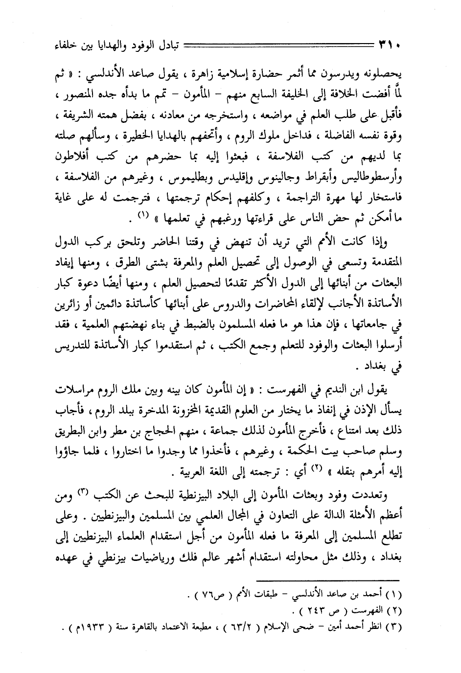 يحصلونه ويدرسون مما أثمر حضارة إسلامية زاهرة، يقول صاعد الأندلسي: «ثم لمّا أفضت الخلافة إلى الخليفة السابع منهم- المأمون- تمم ما بدأه جده المنصور، فأقبل على طلب العلم في مواضعه، واستخرجه من معادنه، بفضل همته الشريفة، وقوة نفسه الفاضلة، فداخل ملوك الروم، وأتحفهم بالهدايا الخطيرة، وسألهم صلته بما لديهم من كتب الفلاسفة، فبعثوا إليه بما حضرهم من كتب أفلاطون وأرسطوطاليس وأبقراط وجالينوس وإقليدس وبطليموس، وغيرهم من الفلاسفة، فاستخار لها مهرة التراجمة، وكلفهم إحكام ترجمتها، فترجمت له على غاية ما أمكن ثم حض الناس على قراءتها ورغبهم في تعلمها» «1» .