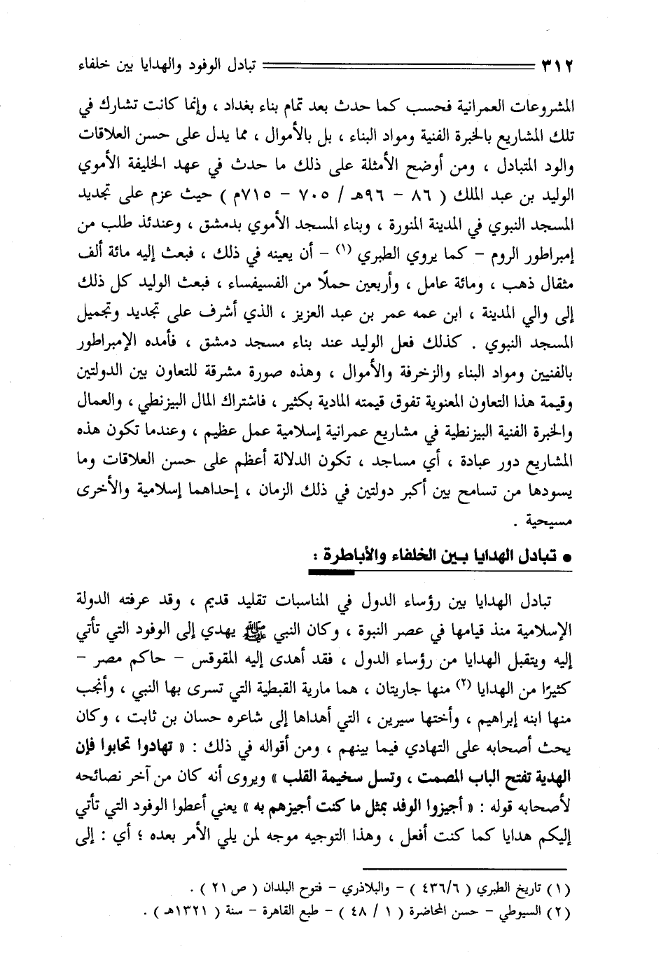 المشروعات العمرانية فحسب كما حدث بعد تمام بناء بغداد، وإنما كانت تشارك في تلك المشاريع بالخبرة الفنية ومواد البناء، بل بالأموال، مما يدل على حسن العلاقات والود المتبادل، ومن أوضح الأمثلة على ذلك ما حدث في عهد الخليفة الأموي الوليد بن عبد الملك (86- 96 هـ/ 705- 715 م) حيث عزم على تجديد المسجد النبوي في المدينة المنورة، وبناء المسجد الأموي بدمشق، وعندئذ طلب من إمبراطور الروم- كما يروي الطبري «1» - أن يعينه في ذلك، فبعث إليه مائة ألف مثقال ذهب، ومائة عامل، وأربعين حملا من الفسيفساء، فبعث الوليد كل ذلك إلى والي المدينة، ابن عمه عمر بن عبد العزيز، الذي أشرف على تجديد وتجميل المسجد النبوي. كذلك فعل الوليد عند بناء مسجد دمشق، فأمده الإمبراطور بالفنيين ومواد البناء والزخرفة والأموال، وهذه صورة مشرقة للتعاون بين الدولتين وقيمة هذا التعاون المعنوية تفوق قيمته المادية بكثير، فاشتراك المال البيزنطي، والعمال والخبرة الفنية البيزنطية في مشاريع عمرانية إسلامية عمل عظيم، وعند ما تكون هذه المشاريع دور عبادة، أي مساجد، تكون الدلالة أعظم على حسن العلاقات وما يسودها من تسامح بين أكبر دولتين في ذلك الزمان، إحداهما إسلامية والآخرى مسيحية.