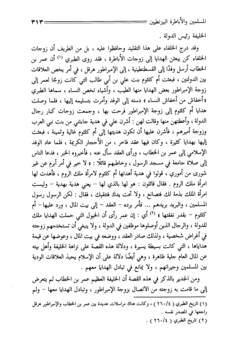 وقد درج الخلفاء على هذا التقليد وحافظوا عليه، بل من الطريف أن زوجات الخلفاء كن يبعثن الهدايا إلى زوجات الأباطرة، فقد روى الطبري «1» أن عمر بن الخطاب أرسل وفدا إلى القسطنطينية، إلى الإمبراطور هرقل، في أمر يخص العلاقات بين الدولتين، فبعثت أم كلثوم بنت علي بن أبي طالب التي كانت زوجا لعمر إلى زوجة الإمبراطور بعض الهدايا منها الطيب، وأشياء تخص النساء، سماها الطبري «أخفاش من أخفاش النساء» دسته إلى الوفد وأمرت بتسليمه إليها، فلما وصلت هدايا أم كلثوم إلى زوجة الإمبراطور فرحت بها، وجمعت زوجات كبار رجال الدولة، وأعطتهن منها وقالت لهن: أشرن علي في هدية جاءتني من بنت نبي العرب وزوجة أميرهم، فأشرن عليها أن تكون هديتها إلى أم كلثوم غالية وثمينة، فبعثت إليها بهدايا كثيرة، وكان فيها عقد فاخر، من الأحجار الكريمة، فلما عاد الوفد الإسلامي إلى عمر بن الخطاب، ورأى العقد سأل عنه، فأخبروه الخبر، فدعا الناس إلى صلاة جامعة في مسجد الرسول، وخاطبهم قائلا: «لا خير في أمر أبرم عن غير شورى من أموري، قولوا في هدية أهدتها أم كلثوم لامرأة ملك الروم، فأهدت لها امرأة ملك الروم. فقال قائلون: هو لها بالذي لها- يعني هدية بهدية- وليست امرأة الملك بذمة لك فتصانع، ولا تحت يدك فتتقيك، فقال: لكن الرسول رسول المسلمين، والبريد بريدهم ... فأمر برده- العقد- إلى بيت المال، ورد عليها- أم كلثوم- بقدر نفقتها» «2» أي: إن عمر رأى أن الخيول التي حملت الهدايا ملك للدولة، والرجال الذين أوصلوها موظفين في الدولة، ولا ينبغي أن تستخدمهم زوجته في أغراض شخصية، ولذلك صادر العقد، ووضعه في بيت المال، وعوضها عن قيمة هداياها، التي كانت بسيطة يسيرة، ودلالة هذه القصة على نزاهة الخليفة وأهل بيته عن المال العام جلية ظاهرة، وهي أيضا دلالة على أن الإسلام يحبذ العلاقات الودية بين المسلمين وجيرانهم، ولا يمانع في تبادل الهدايا معهم.