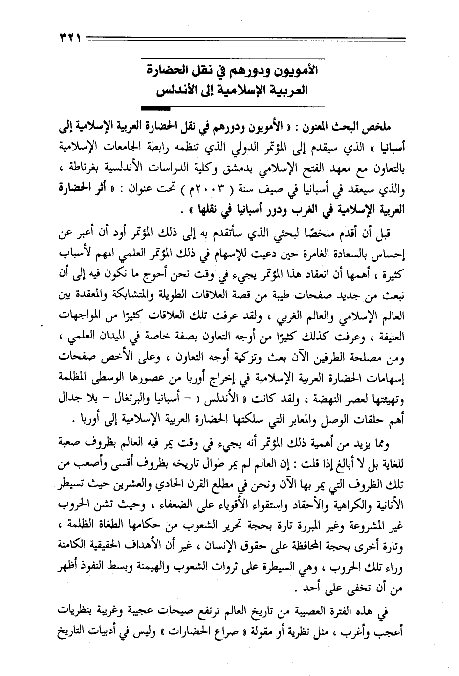 المعنون: «الأمويون ودورهم في نقل الحضارة العربية الإسلامية إلى أسبانيا» الذي سيقدم إلى المؤتمر الدولي الذي تنظمه رابطة الجامعات الإسلامية بالتعاون مع معهد الفتح الإسلامي بدمشق وكلية الدراسات الأندلسية بغرناطة، والذي سيعقد في أسبانيا في صيف سنة (2003 م) تحت عنوان: «أثر الحضارة العربية الإسلامية في الغرب ودور أسبانيا في نقلها» .
