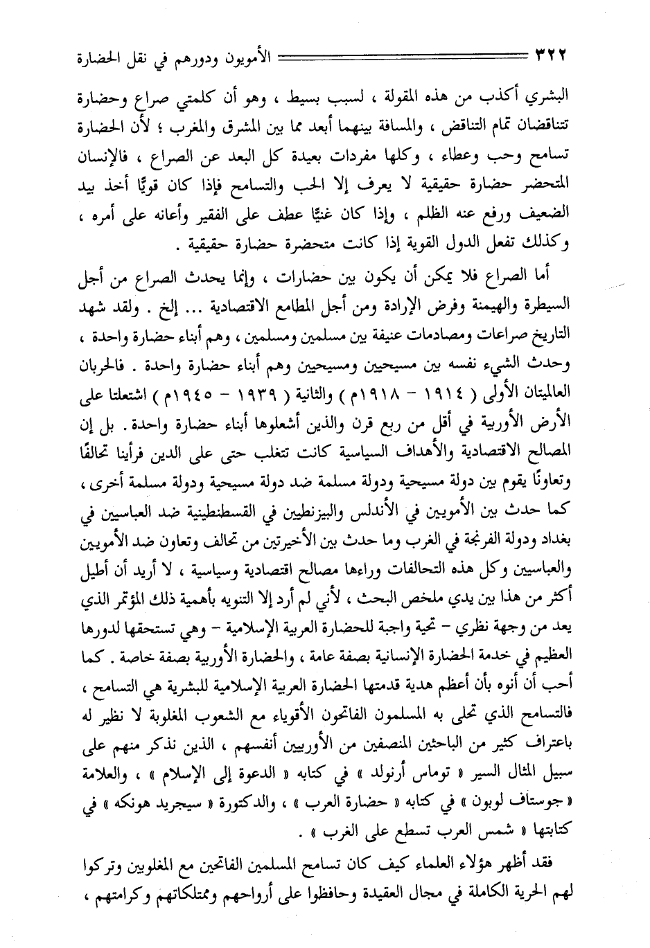 أما الصراع فلا يمكن أن يكون بين حضارات، وإنما يحدث الصراع من أجل السيطرة والهيمنة وفرض الإرادة ومن أجل المطامع الاقتصادية ... إلخ. ولقد شهد التاريخ صراعات ومصادمات عنيفة بين مسلمين ومسلمين، وهم أبناء حضارة واحدة، وحدث الشيء نفسه بين مسيحيين ومسيحيين وهم أبناء حضارة واحدة. فالحربان العالميتان الأولى (1914- 1918 م) والثانية (1939- 1945 م) اشتعلتا على الأرض الأوربية في أقل من ربع قرن والذين أشعلوها أبناء حضارة واحدة. بل إن المصالح الاقتصادية والأهداف السياسية كانت تتغلب حتى على الدين فرأينا تحالفا وتعاونا يقوم بين دولة مسيحية ودولة مسلمة ضد دولة مسيحية ودولة مسلمة أخرى، كما حدث بين الأمويين في الأندلس والبيزنطيين في القسطنطينية ضد العباسيين في بغداد ودولة الفرنجة في الغرب وما حدث بين الأخيرتين من تحالف وتعاون ضد الأمويين والعباسيين وكل هذه التحالفات وراءها مصالح اقتصادية وسياسية، لا أريد أن أطيل أكثر من هذا بين يدي ملخص البحث، لأني لم أرد إلا التنويه بأهمية ذلك المؤتمر الذي يعد من وجهة نظري- تحية واجبة للحضارة العربية الإسلامية- وهي تستحقها لدورها العظيم في خدمة الحضارة الإنسانية بصفة عامة، والحضارة الأوربية بصفة خاصة. كما أحب أن أنوه بأن أعظم هدية قدمتها الحضارة العربية الإسلامية للبشرية هي التسامح، فالتسامح الذي تحلى به المسلمون الفاتحون الأقوياء مع الشعوب المغلوبة لا نظير له باعتراف كثير من الباحثين المنصفين من الأوربيين أنفسهم، الذين نذكر منهم على سبيل المثال السير «توماس أرنولد» في كتابه «الدعوة إلى الإسلام» ، والعلامة «جوستاف لوبون» في كتابه «حضارة العرب» ، والدكتورة «سيجريد هونكه» في كتابتها «شمس العرب تسطع على الغرب» .