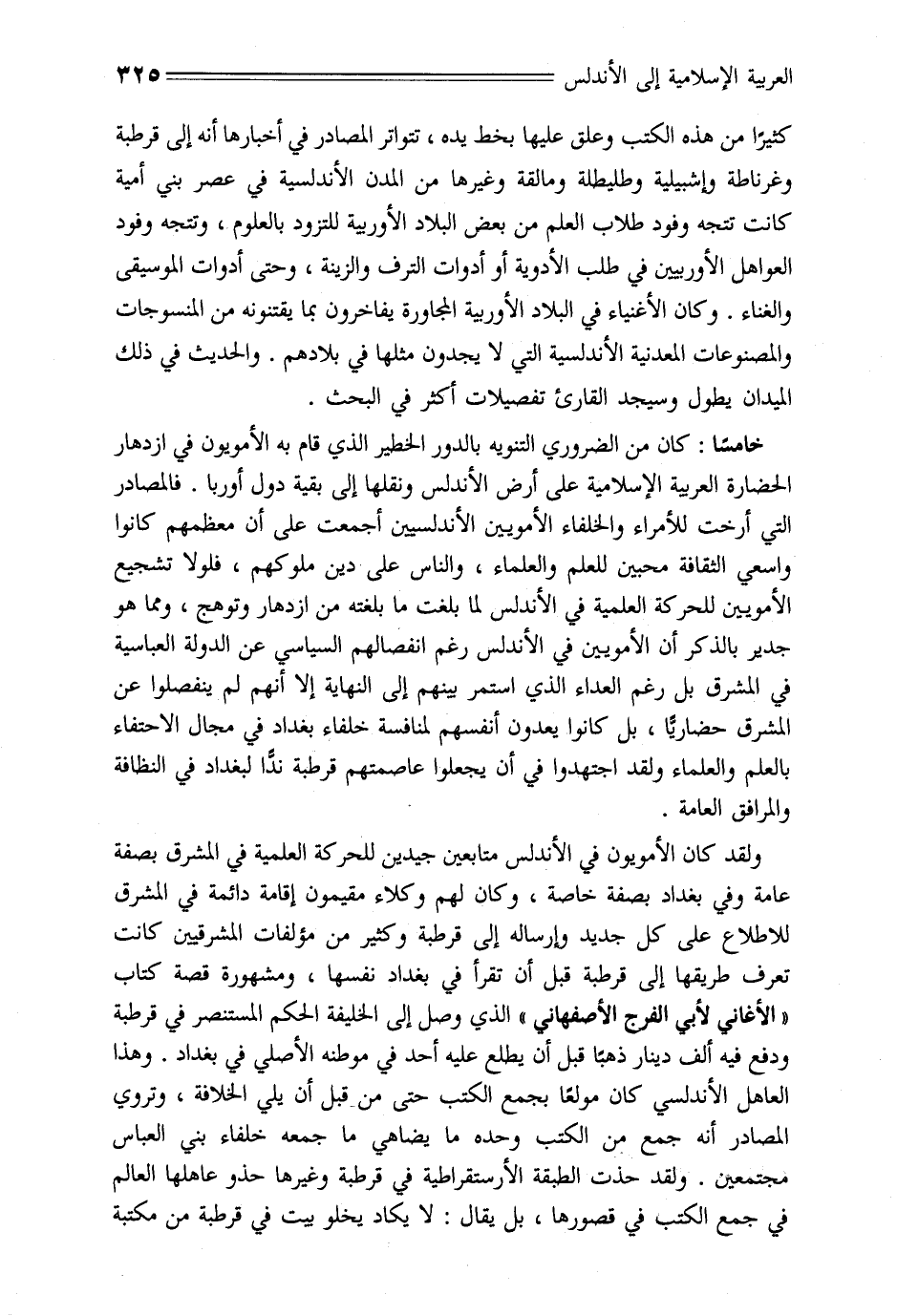 خامسا: كان من الضروري التنويه بالدور الخطير الذي قام به الأمويون في ازدهار الحضارة العربية الإسلامية على أرض الأندلس ونقلها إلى بقية دول أوربا. فالمصادر التي أرخت للأمراء والخلفاء الأمويين الأندلسيين أجمعت على أن معظمهم كانوا واسعي الثقافة محبين للعلم والعلماء، والناس على دين ملوكهم، فلولا تشجيع الأمويين للحركة العلمية في الأندلس لما بلغت ما بلغته من ازدهار وتوهج، ومما هو جدير بالذكر أن الأمويين في الأندلس رغم انفصالهم السياسي عن الدولة العباسية في المشرق بل رغم العداء الذي استمر بينهم إلى النهاية إلا أنهم لم ينفصلوا عن المشرق حضاريّا، بل كانوا يعدون أنفسهم لمنافسة خلفاء بغداد في مجال الاحتفاء بالعلم والعلماء ولقد اجتهدوا في أن يجعلوا عاصمتهم قرطبة ندّا لبغداد في النظافة والمرافق العامة.